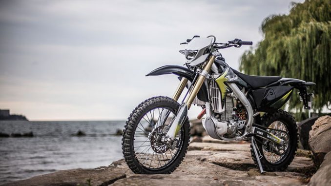 OHC, 4 Valve, Liquid Cooled 450cc, full aluminum twin spar style frame, aluminum linked rear suspension, on-road and off-road versions available. A true Hooligun on the roads, keep that front tire down sir!