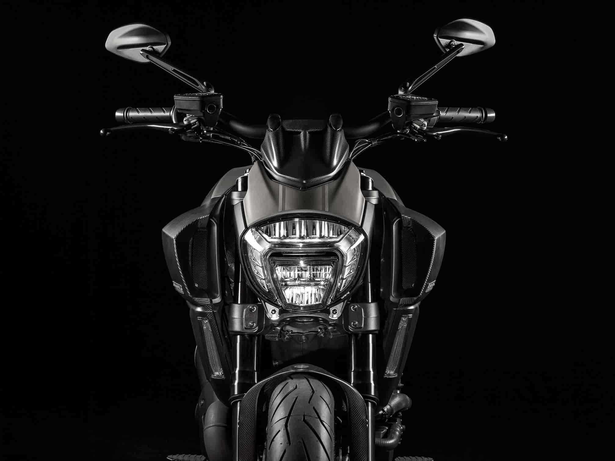 The Diavel is exclusively dressed in Dark Stealth livery with a continuing theme of black trellis frame and wheels and matching black-finished silencers. The Diavel Carbon offers the choice of traditional Ducati Red with high-tech Matte Carbon and red frame or the stunning Star White with Matte Carbon and white frame. Both Carbon Diavel models roll on black, forged wheels by Marchesini, turned and milled to expose the natural aluminium.