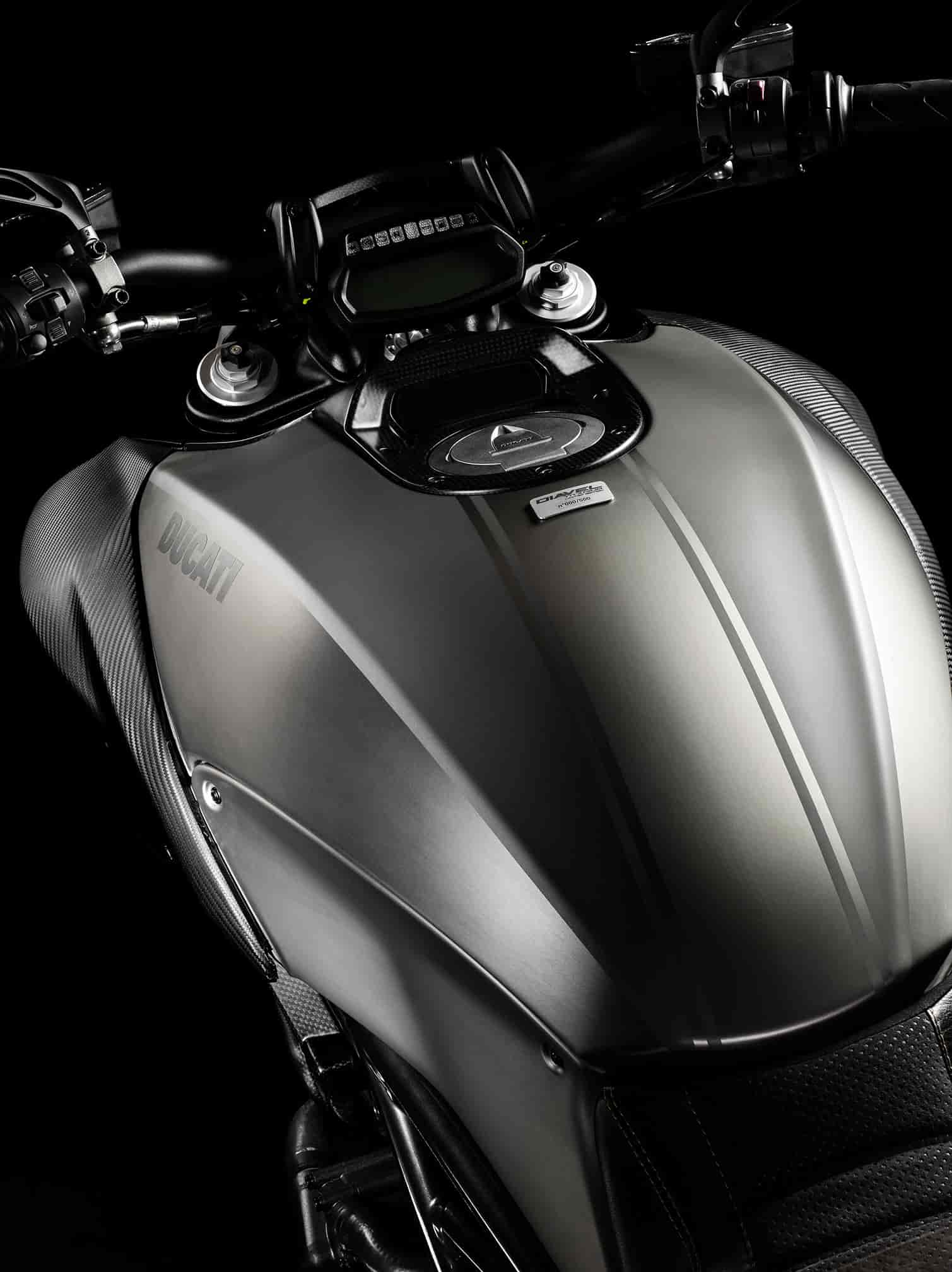 The Diavel’s 17 l (4.5 US gal) fuel tank represents an integral part of the bike’s overall styling. Its wide, long lines sweep down from the headlamp assembly into the seat and rear sub-frame to create a seamless profile. While the focal point of the tank is the high resolution display panel, the steel tank skin and wellsculpted knee panels add a solid feel to the Diavel and a high tech composite look to the Diavel Carbon.