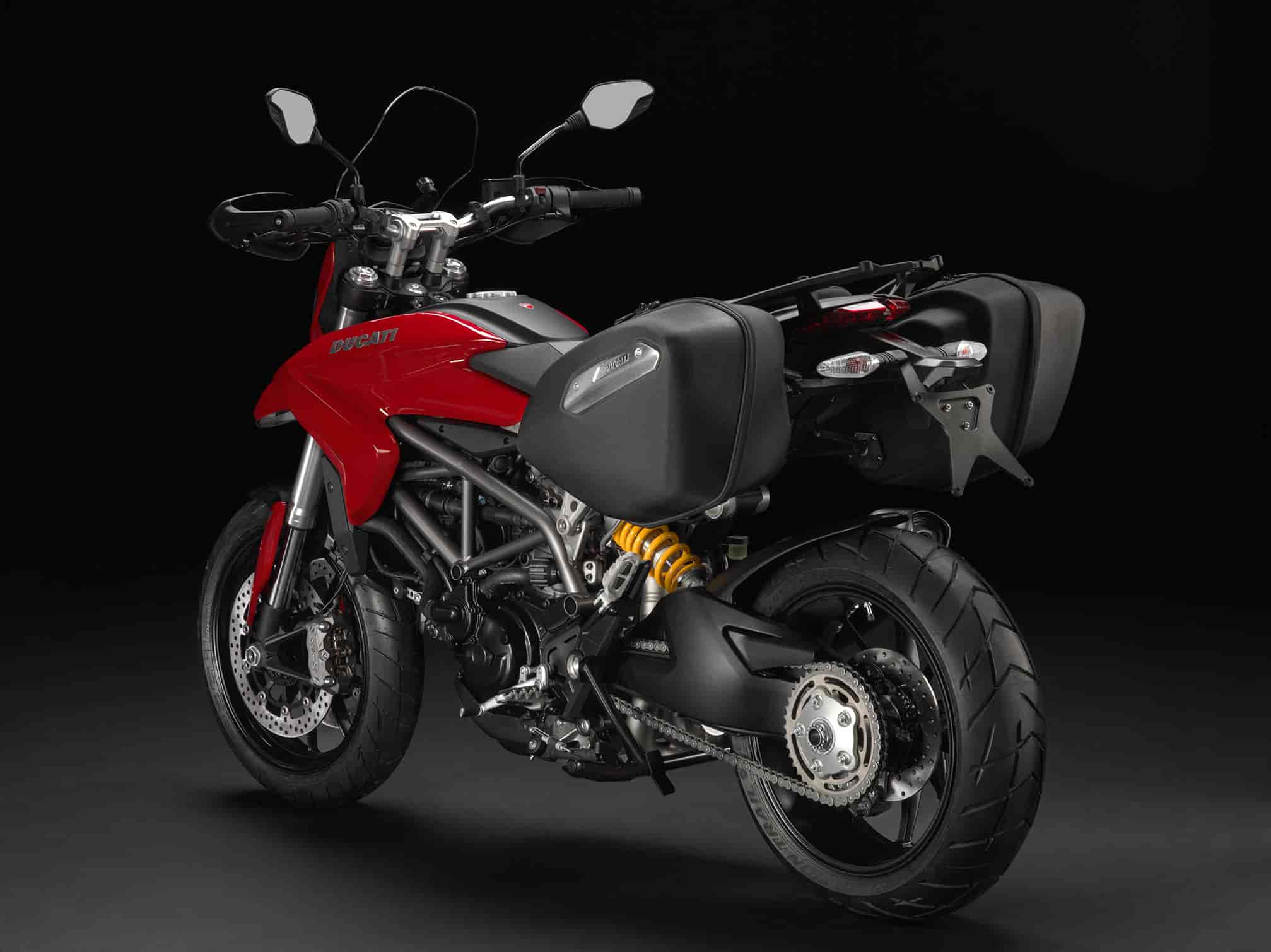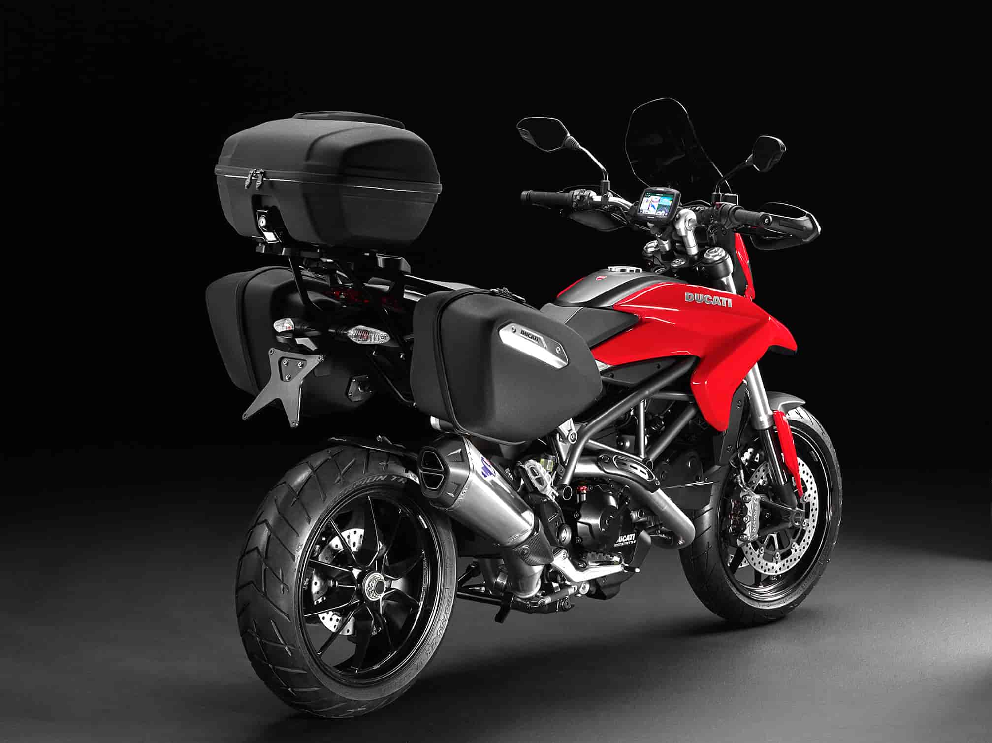 The full touring trim tips the scales with a dry weight of 181 kg (399 lb) and rides on Pirelli Scorpion Trail tyres, mounted on 10-spoke 1199 Panigale-style cast aluminium wheels. The Hyperstrada is finished in Ducati red against subtle racing grey Trellis frames and black wheels and has side luggage in textured black with polished stainless steel “Ducati” name plates.