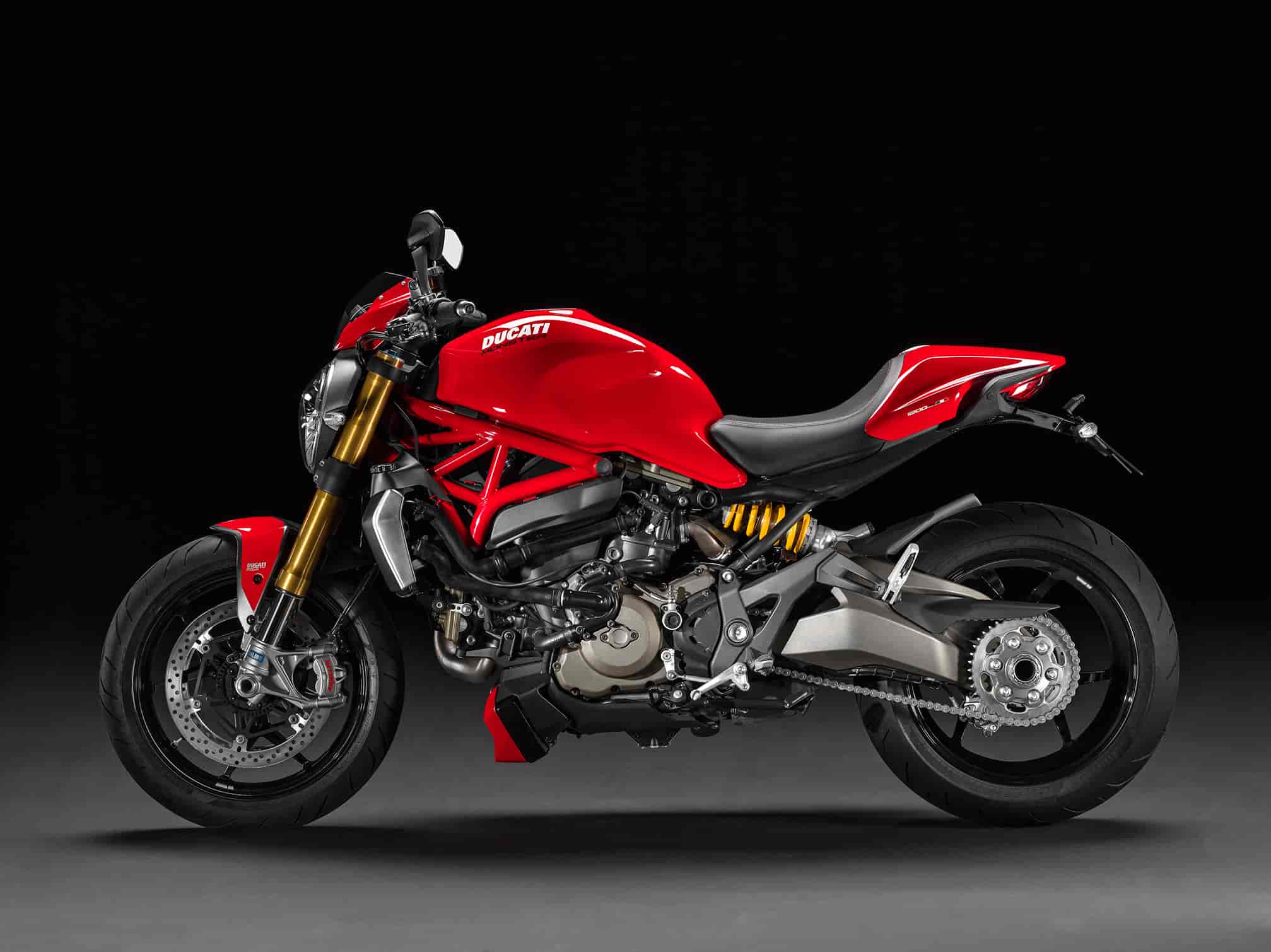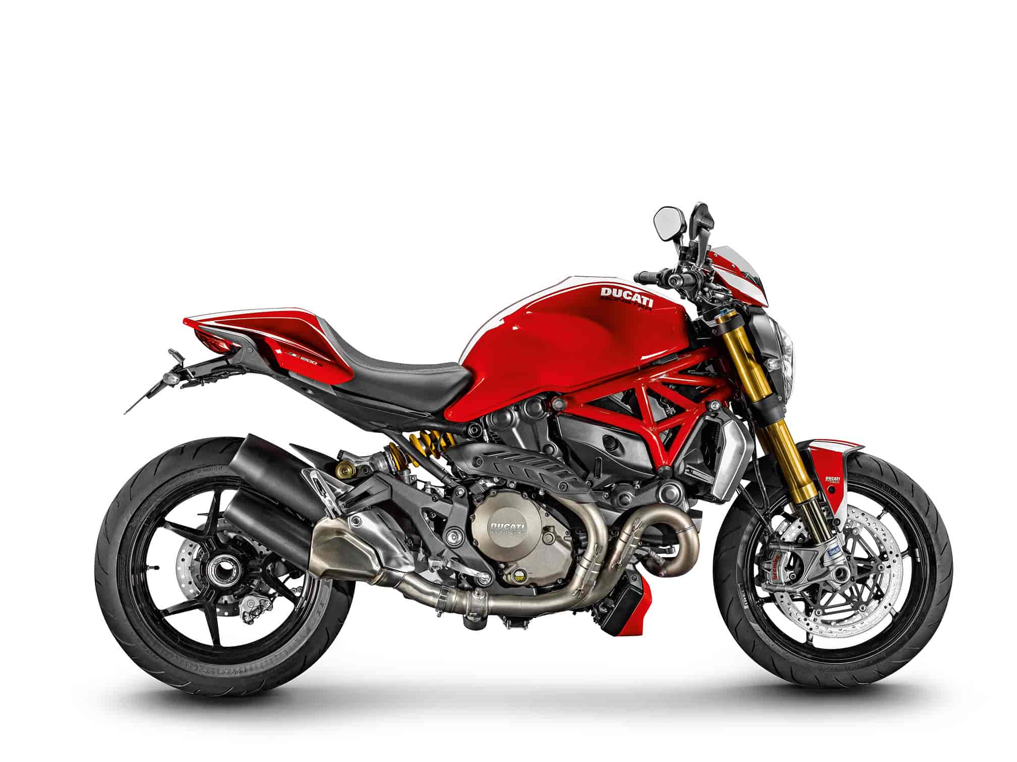 The Monster 1200 is presented in Ducati red with red frame and black wheels, the Monster 1200 S offers Ducati red with red frame and glossy black wheels in addition to the striking scheme of white with bronzecoloured frame and glossy black wheels.