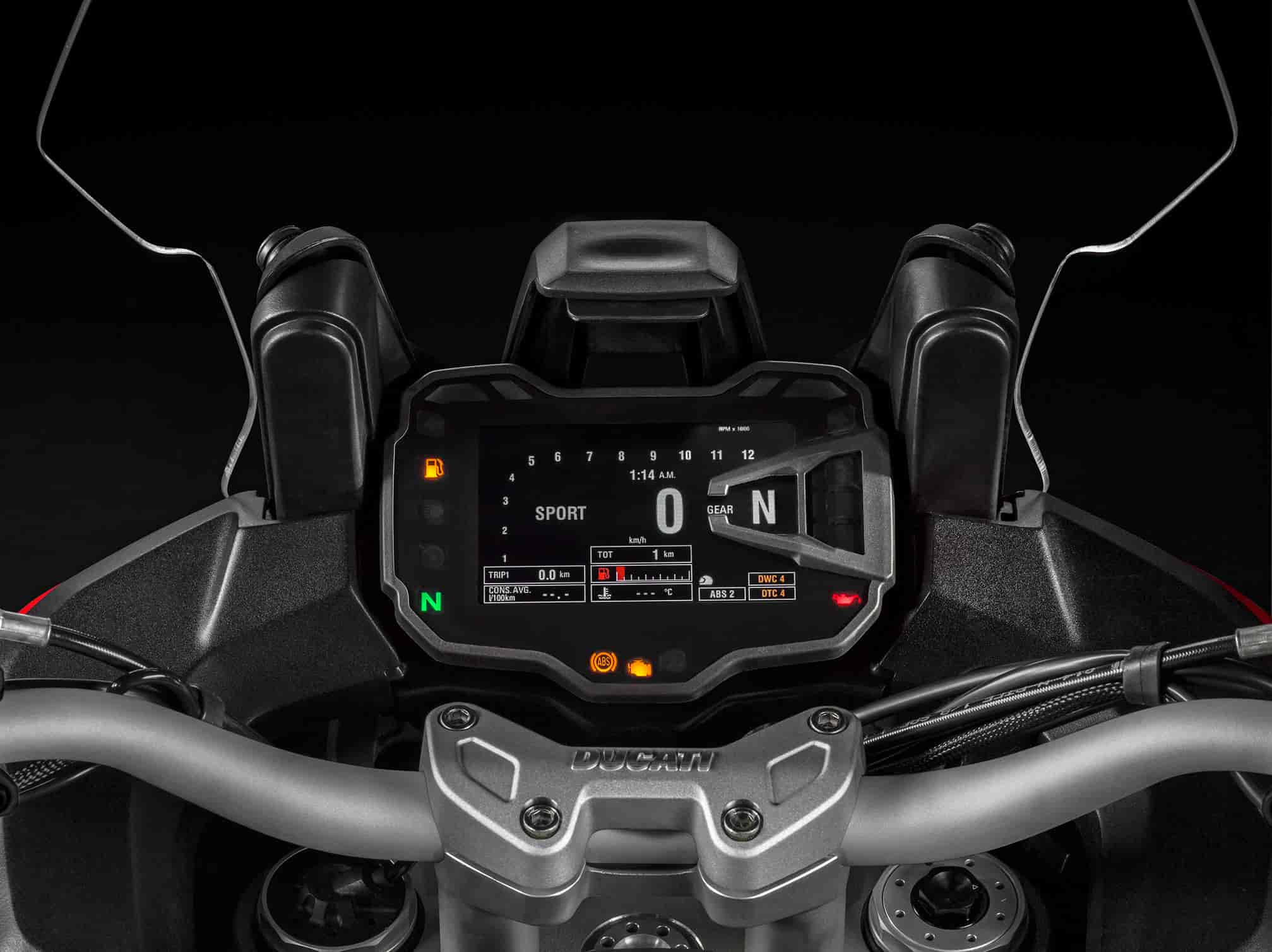 Riding Modes, Power Modes, RbW, Ducati Safety Pack (cornering ABS + DTC), Ducati Skyhook Suspension Evo (DSS), Ducati Wheelie Control (DWC), Cruise Control, Full LED headlamp with Ducati Cornering Lights, Hands-Free, Backlit handlebar switches, Ducati Multimedia System (DMS), Full-colour TFT display, Anti-theft ready, Heated grips ready, Supplementary lights ready