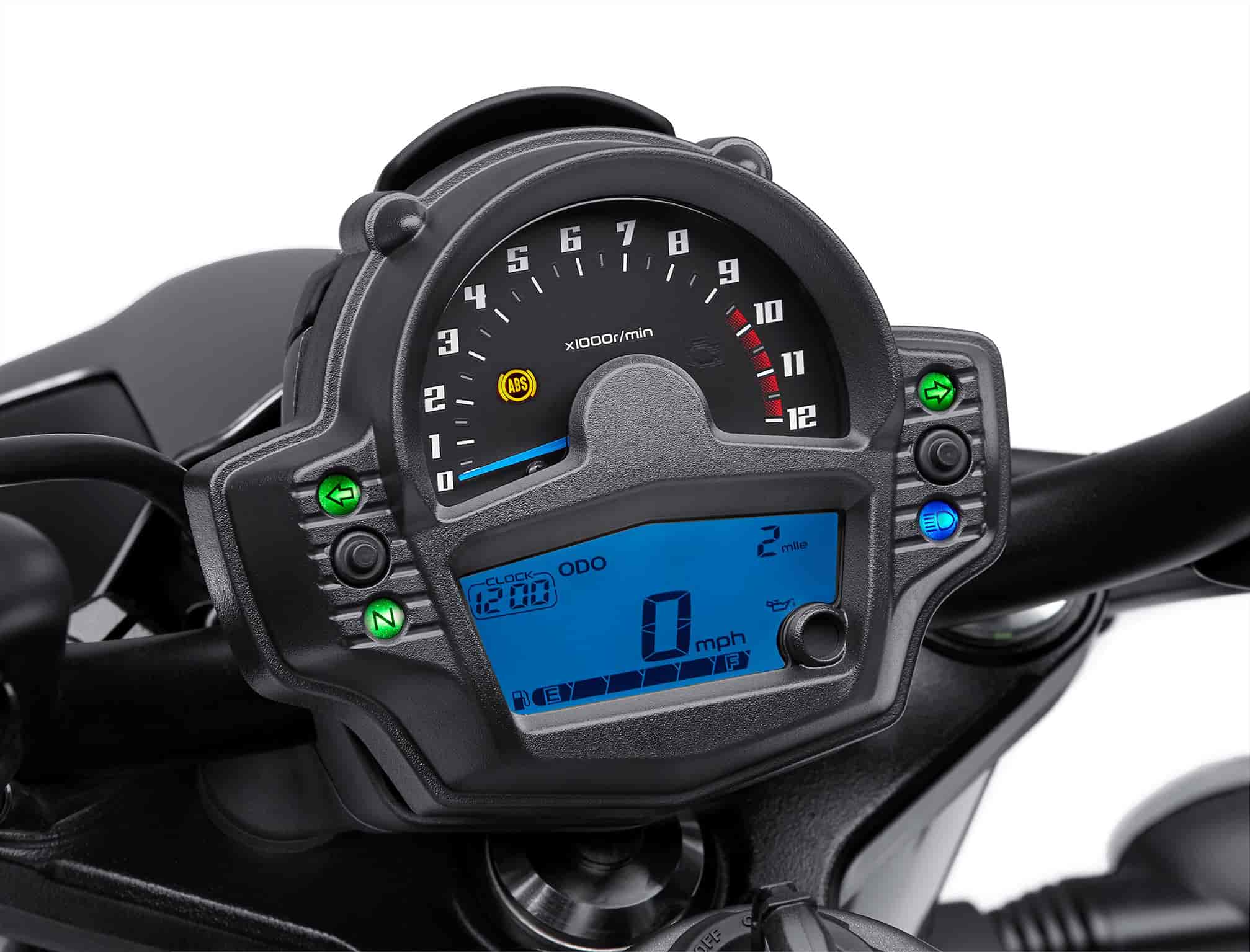 The instrumentation consists of a compact analog tachometer with a multifunction dual-window. The digital display features speed, fuel level, clock, odometer, dual trip meters, range, average and instant fuel economy as well as an Economical Riding Indicator to show when the rider is optimizing fuel economy.