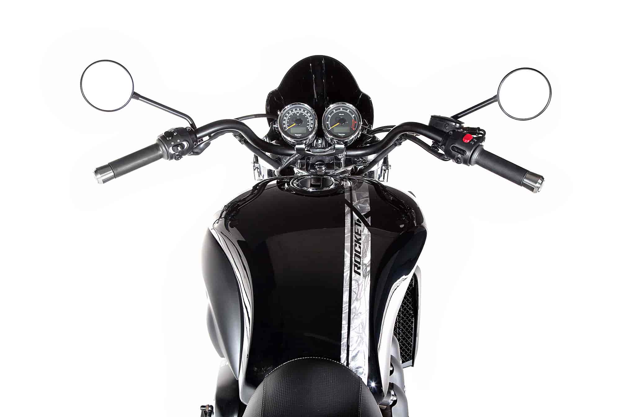 A black fly screen shrouds the chrome ringed instruments to add even more visual presence. The mean look has also been further enhanced with the addition of black finishing to the handlebars, mirrors, gear, and brake levers. The Rocket’s signature 5-spoke aluminium alloy wheels have also received the black treatment and are skilfully finished off with a complimenting hand painted pinstripe.