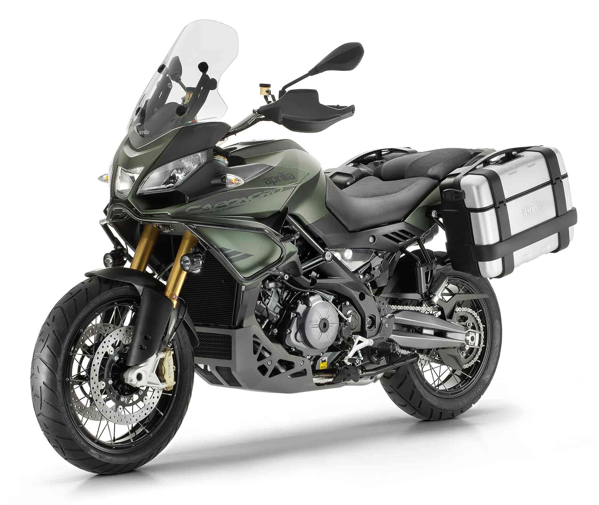 FEATURING SPOKED RIMS AND A 19″ FRONT WHEEL, HARD PANNIERS, ENGINE GUARDS, AND ADDITIONAL LED LIGHTS, THE APRILIA CAPONORD 1200 RALLY IS SUPER EQUIPPED AND MORE ECLECTIC, OFFERING BETTER PROTECTION AND COMFORT. THE HIGH PERFORMANCE OF THE TWIN-CYLINDER IS A PERFECT MATCH FOR THE EXCEPTIONAL CHASSIS FEATURES TYPICAL OF ALL APRILIA BIKES AS WELL AS THE TECHNOLOGICAL CONTENT SUCH AS APRILIA DYNAMIC DAMPING (ADD), THE PATENTED SEMI-ACTIVE SUSPENSION SYSTEM THAT AUTOMATICALLY ADAPTS CALIBRATION BASED ON ROAD SURFACE AND RIDING STYLE