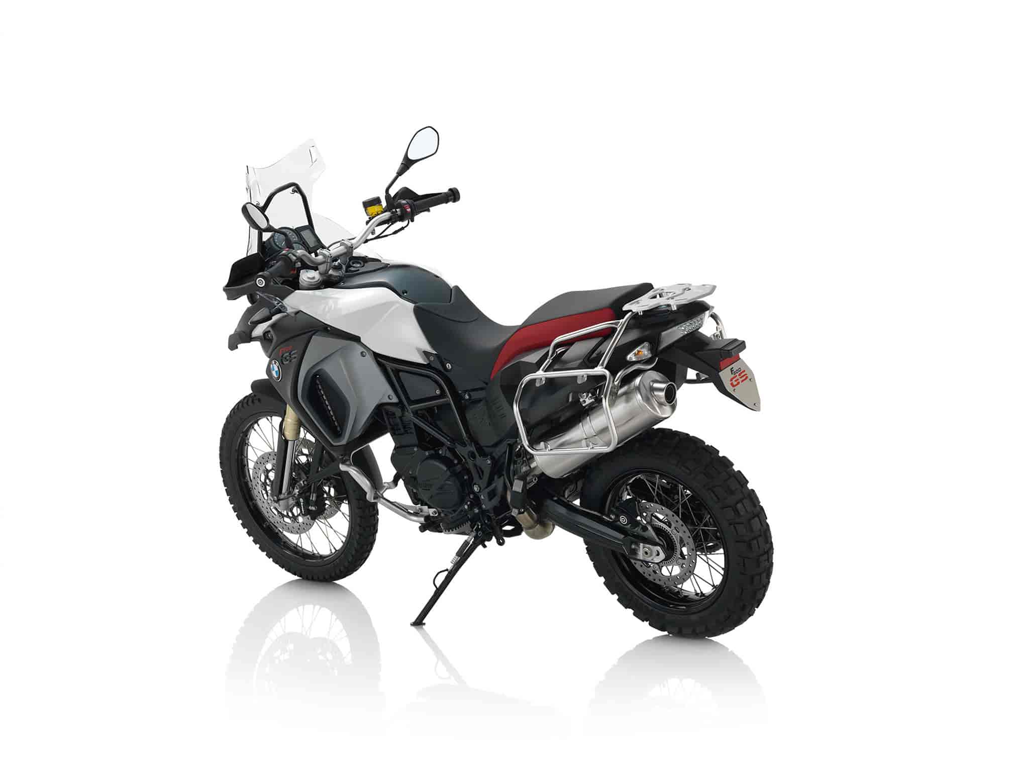 The F 800 GS Adventure boasts a new, masculine bodywork styling that underlines its globetrotting abilities, while a new, very comfortable bench seat, a larger windscreen for improved protection against the elements and hand protectors also support this image. Other new standard specification on the F 800 GS Adventure includes wide enduro footrests, an adjustable, reinforced foot brake lever, an engine protection bar and a pannier rack which also functions as a tank protection bar.