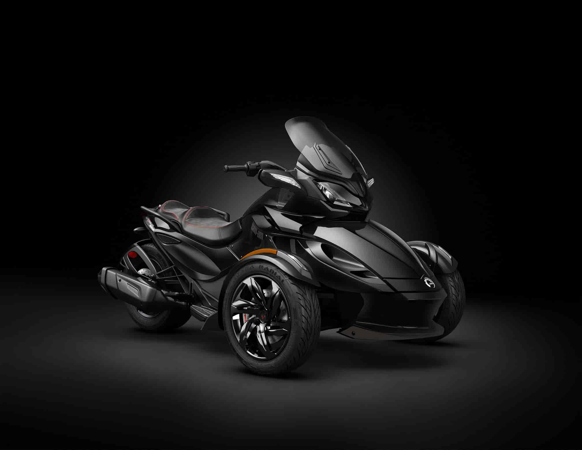 Spyder ST-S models sport black chrome front wheels, premium fenders with integrated LED lights, Carbon Black parts and Black suede seat with Red stitching for a striking look.