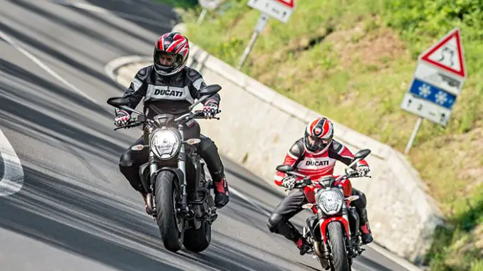 Available at Ducati Dealerships the Monster 821 Dark is presented in dark stealth with black frame and black wheels, while the Monster 821 is dressed in Ducati red with red frame and black wheels or star white silk with red frame and matte red wheels. Both red and white liveries are equipped with colour-matched single-seat covers. The model is also made available to restricted license holders with the specially regulated power versions of 25kw for Switzerland and 35kw for other participating countries. The Monster 821 Stripe, instead, sports the exclusive red colour scheme with double white side-stripe on mudguard, tank and passenger seat cover, plus the red frame and black wheels.