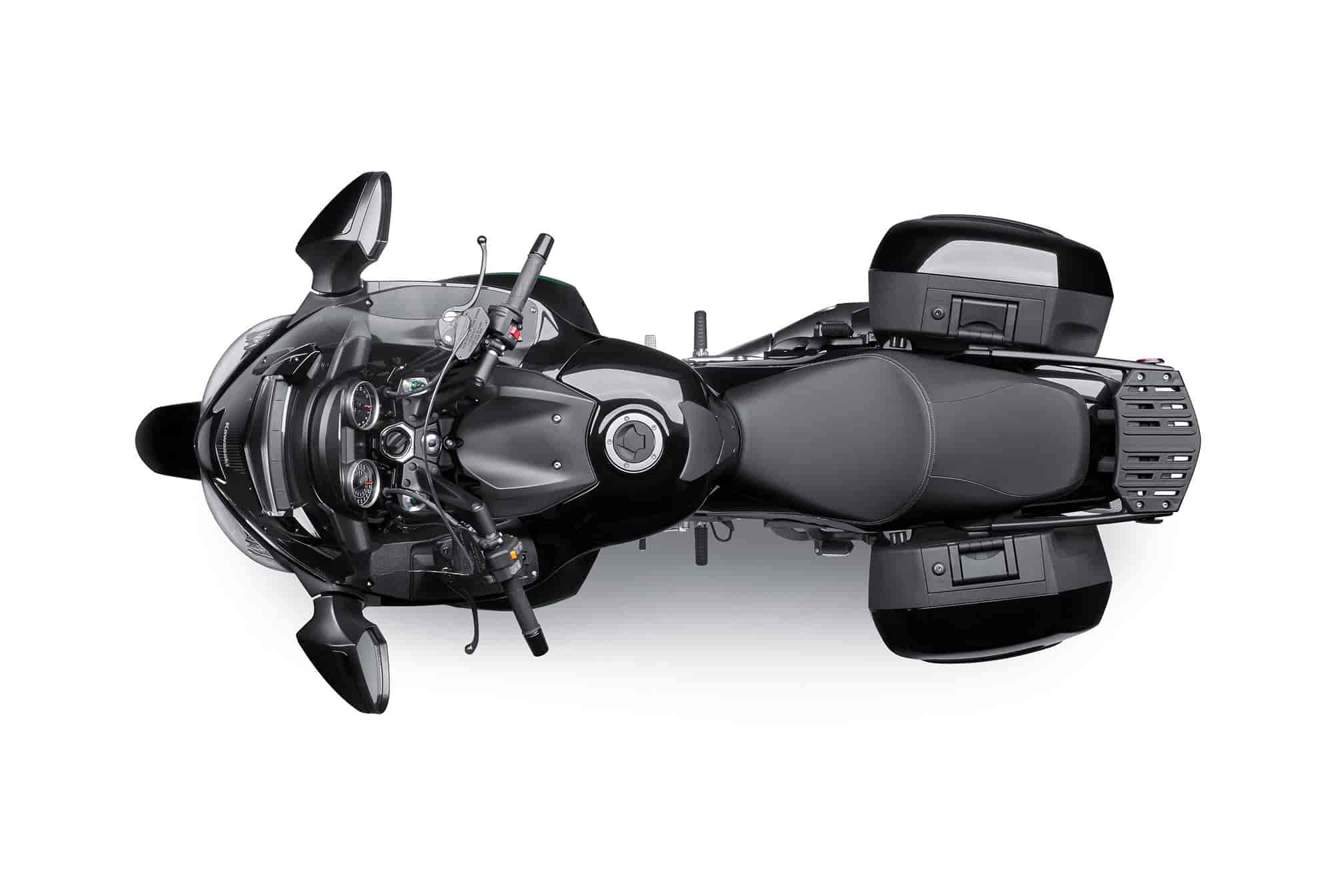 The large-volume panniers are integrally designed to complement the GTR’s overall styling package. The cases are easily detachable, water-resistant and easily hold a full-face helmet. Mounted as close as possible to the bike’s centreline and the bike’s centre of gravity, their lightweight construction was designed to minimise their influence on the bike’s centre of mass.