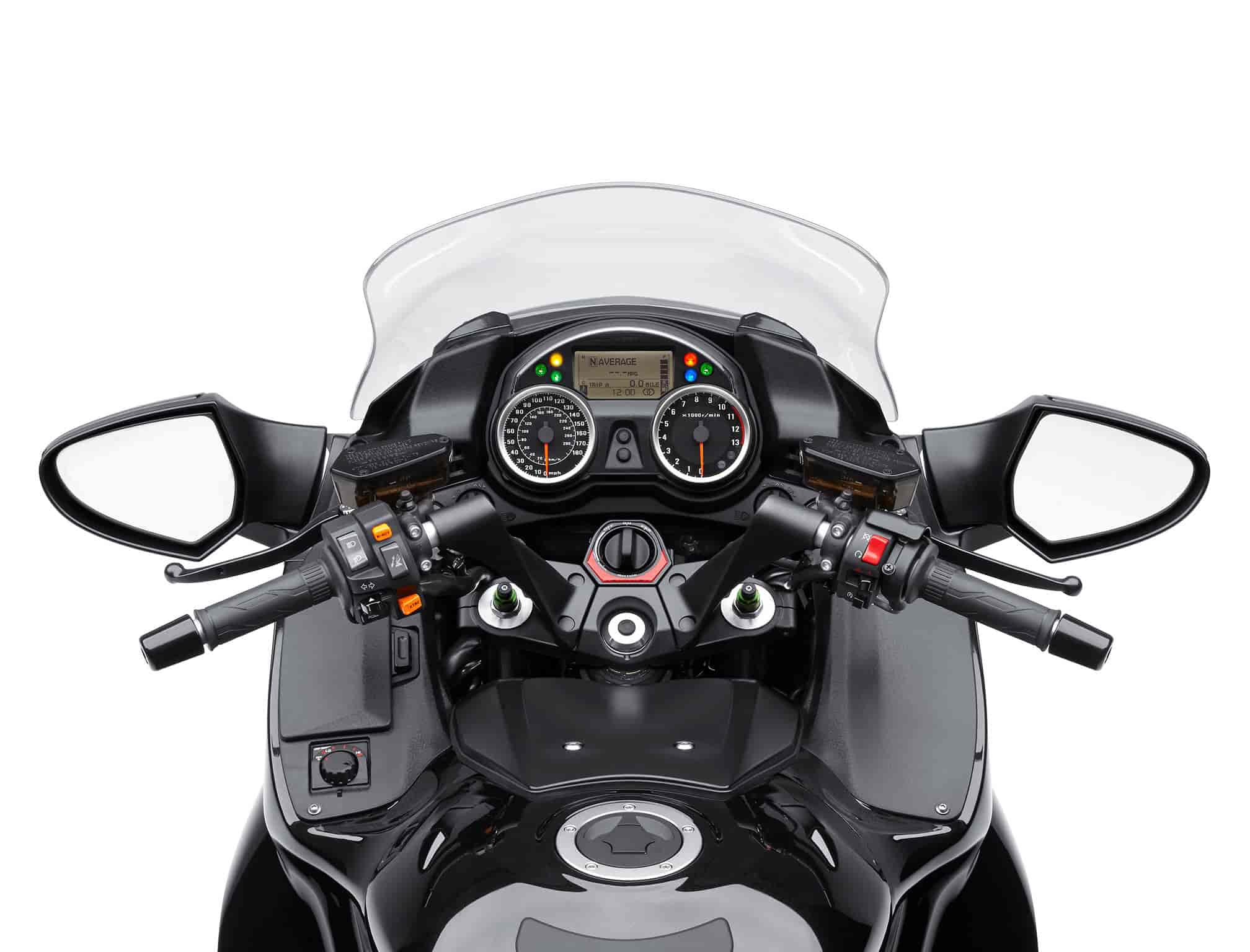 The GTR’s multi-function display now includes an outside air temperature monitor. Other new instrument functions include the K-ACT mode indicator, Economical Riding Indicator, and Fuel Economy Assistance Mode icon. The mode-Select button on the front of the left grip (where the passing button used to be) increases convenience by allowing the rider to change LCD modes without having to take their hand off the handlebar. For MY15 Pressed stainless steel rings for the speedometer and tachometer dials add a higher-quality image to the cockpit.