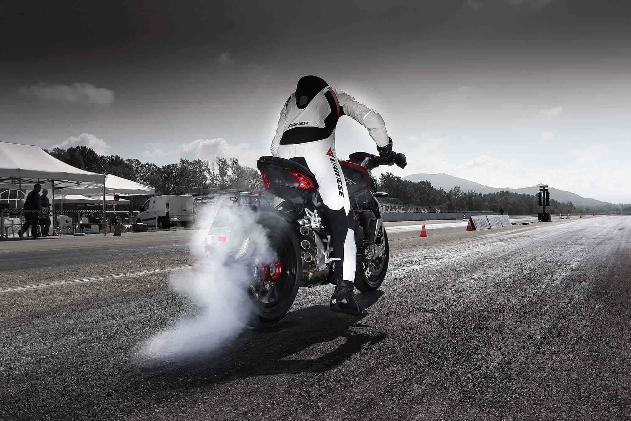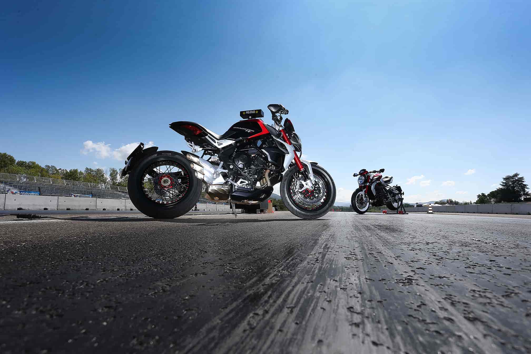 The Brutale 800 Dragster RR measurements are the same as those that made the Brutale 800 Dragster the benchmark for naked sport bikes. The wheelbase is 1,380 mm, with 95 mm of offset on the fork yokes. Tyre crosssections also remain unchanged, with the eye-catching Pirelli Diablo Rosso II 200/50 at the rear. The chassis structure employs a solution shared by on all the latest-generation MV Agusta bikes: an ALS steel tube trellis frame with integrated light aluminium profiles in the rear zone which acts as the pivot for the swingarm. This design choice, in addition to making MV models even more unique and immediately recognisable, effectively meets the dual needs of providing adequate torsional stiffness and keeping overall vehicle weight as low as possible. The suspension uses equally advanced and smoothly integrated components: more specifically, the bike now features a CRC steering damper that can be adjusted to adapt performance to the road, the track or, of course, rider preferences. The Marzocchi fork features upside down aluminium stanchions (43 mm diameter), now lighter and even more attractive thanks to the red anodizing; moreover, DLC (Diamond Like Carbon) coating enhances smoothness and maximises component strength. The 125 mm of travel is the same as that on the adjustable Sachs shock absorber attached to the swingarm. The seat (811 mm high) and pegs offer the same widely acclaimed ergonomics found on the Dragster 800, along with specially customised heel guards. Incredible stopping power is provided by the all-Brembo braking system, which has a pair of floating front discs (diameter 320 mm) equipped with 4-piston callipers and a rear 220 mm disc with a 2-piston calliper. The ABS system rounds out the package, ensuring safety and performance even on slippery or wet surfaces. New features include the stunning spoked wheels, which immediately distinguish the Brutale 800 Dragster RR from any other model: skilled use of anodizing, perfect assembly by hand, a great color scheme – with black or white rims – make this component the focal point of the beefy yet classy coolness that this new MV Agusta exudes. Dedicated graphics and a flawless finish – as highlighted by the multiple layers of paint usually reserved for high end vehicles in the car industry – further emphasise the uniqueness of the Brutale 800 Dragster RR. Brute force. Panache. Charisma.