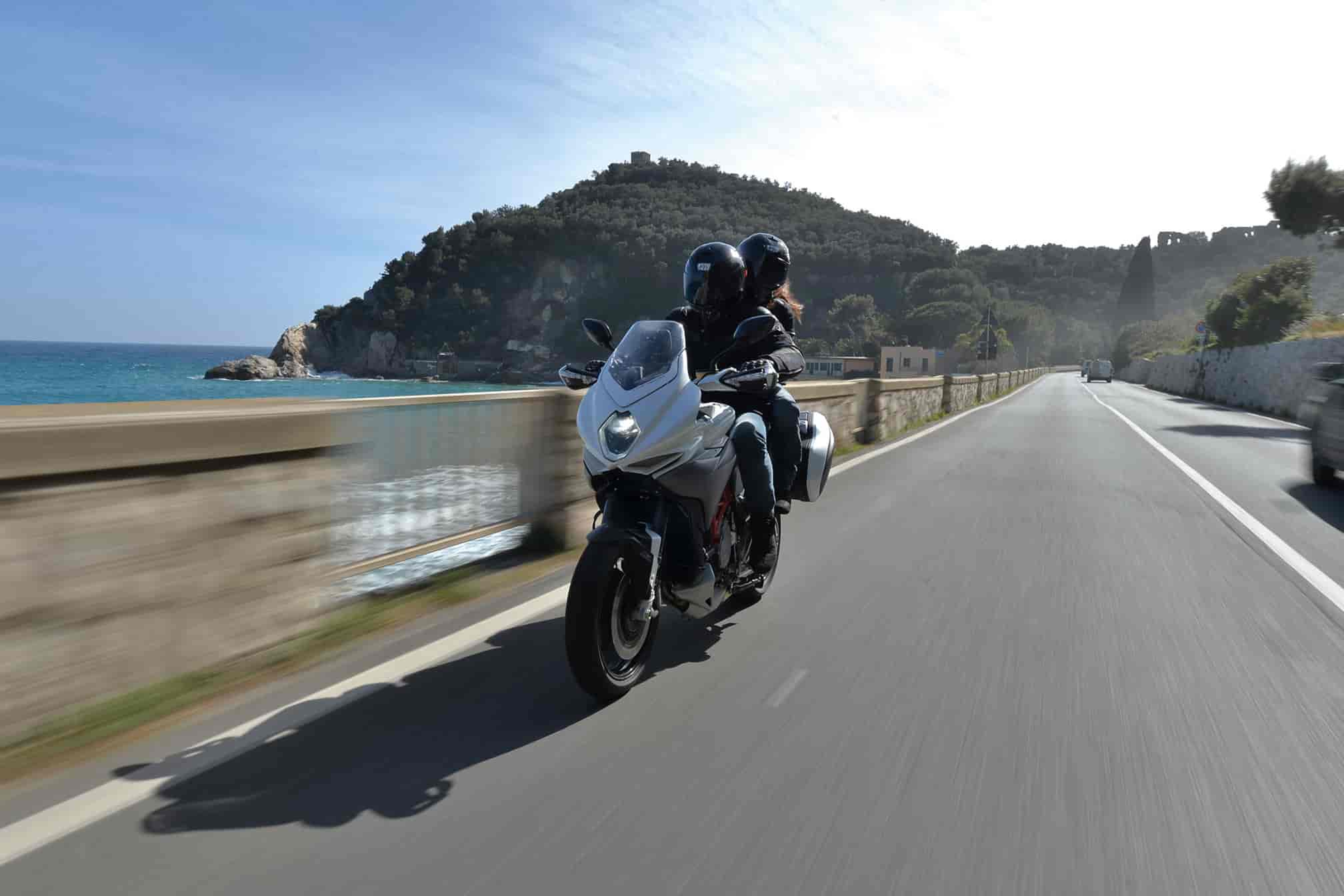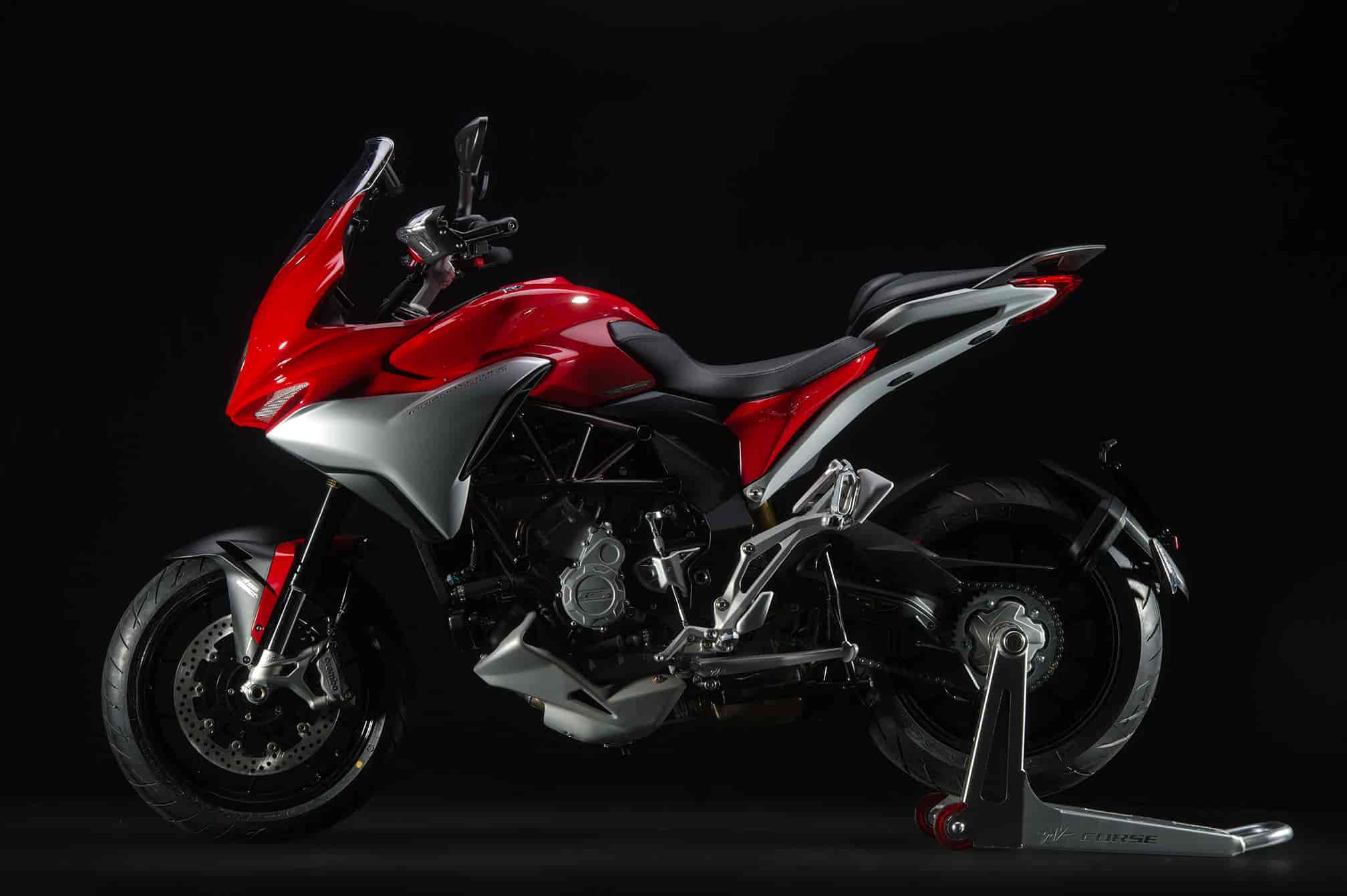 This meant redefining the design priorities: comfort, cargo capacity, smooth operation, low fuel consumption, longer service intervals and everything else a customer looks for in a bike designed for touring. Available in two versions, both share the absolute best technology available today: from the MVCSC (MV Agusta Chassis Stability Control) electronics package to the MVICS 2.0 (Motor & Vehicle Integrated Control System) with inertial platform and the latest generation Bosch ABS. In typical MV Agusta style, we decided to adopt the electronic up&down EAS 2.0 gearbox available on all the engine maps, even on this touring bike. The overall innovation of the design also comes through in the details, such as the Full LED light clusters, the colour instrumentation with TFT technology, built-in Bluetooth device to allow up to 9 different devices to be paired, the immobilizer, two USB sockets and two 12V power points. The Lusso (luxury) version takes the technical level of the Turismo 800 even higher with electronically controlled semi-active suspension as standard equipment, as well as heated hand grips, a centre stand and built-in GPS sensor.