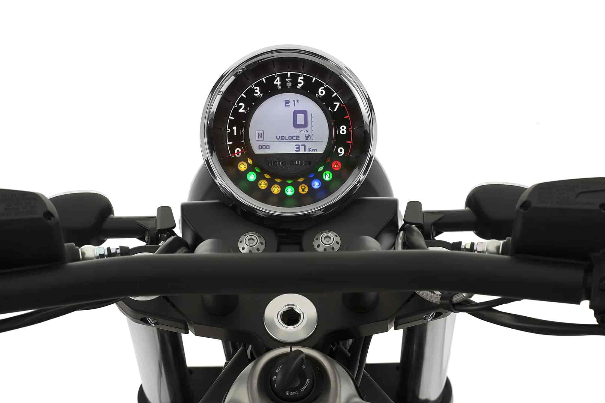 Other stylistic changes to contribute to a more aggressive look can be found in the details: the burnished valve covers, the rear shock absorbers with separate gas reservoir, the light alloy wheels personalized with the Moto Guzzi logo and the minimal black mirrors.