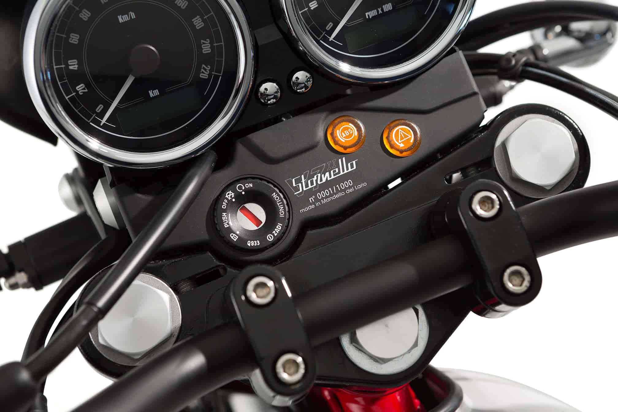 One of the winning characteristics of the V7 has always been the perfect balance between maintaining the typically Moto Guzzi stylistic values with the needs of a modern bike. A dialogue that remains intact on the V7 II Stornello as well. Just like the white/red Stornello 125 Scrambler version in 1972, the colour combination on the V7 II Stornello also plays a key role. Then, like today, the contrast created between the pastel white of the tank and the racing red of the frame, both in glossy finish, manages to strongly characterise the design, as well as enhancing the mechanics of the transversal 90° V twin engine strictly in matte black. The intense red of the frame is clearly revisited both on the tank, trimmed with a typical horizontal stripe in the same colour, with the Eagle from Mandello depicted in it, as well as on the new metallic tubular license plate bracket that uses the already refined V7 II light cluster. The laser inscribed number on the aluminium tag located on the upper part of the headstock identifies the unit number, highlighting its exclusivity.