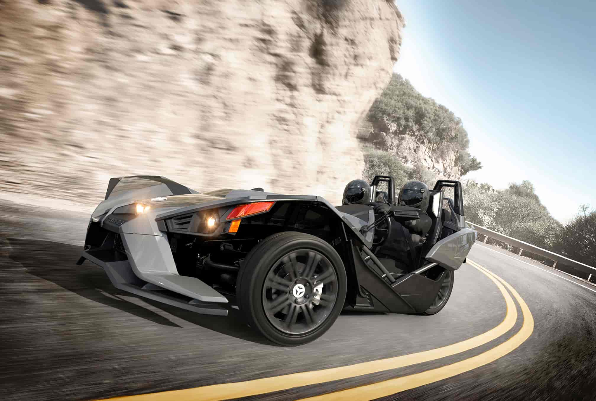 Slingshot is a three-wheeled motorcycle, not an automobile. It doesn’t have airbags, meet automotive safety standards, and it may handle differently than other vehicles, especially in wet conditions. Always wear helmets, seat belts, and don’t drink and drive.