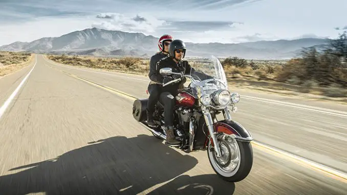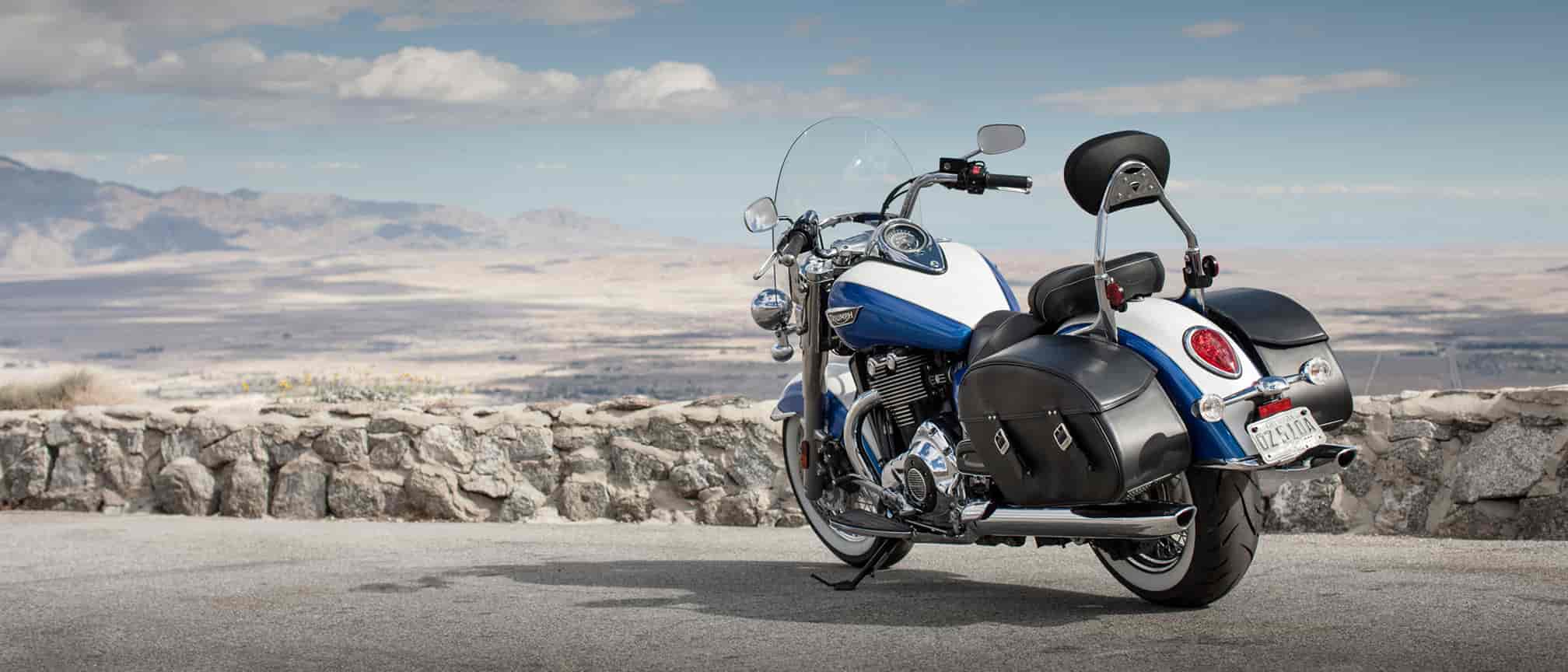 •Shrouded forks, quick-detach windshield, detachable leather saddlebags and deep, custom-style mudguards