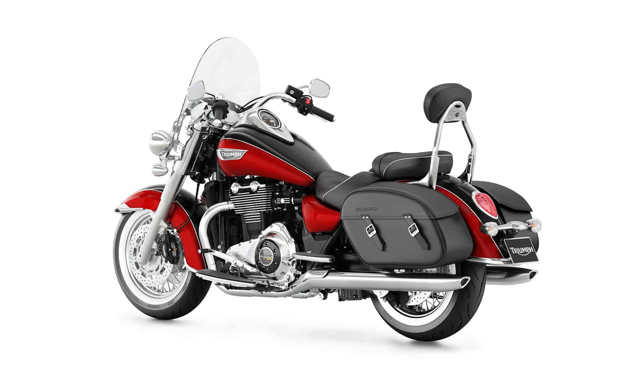Longer trips on the Triumph Thunderbird Commander will benefit from a pair of sumptuous, genuine leather, top-loading panniers with ample 52-litre capacity. Includes chrome plated, Triumph-branded buckles and hidden snap clips for ease of use.