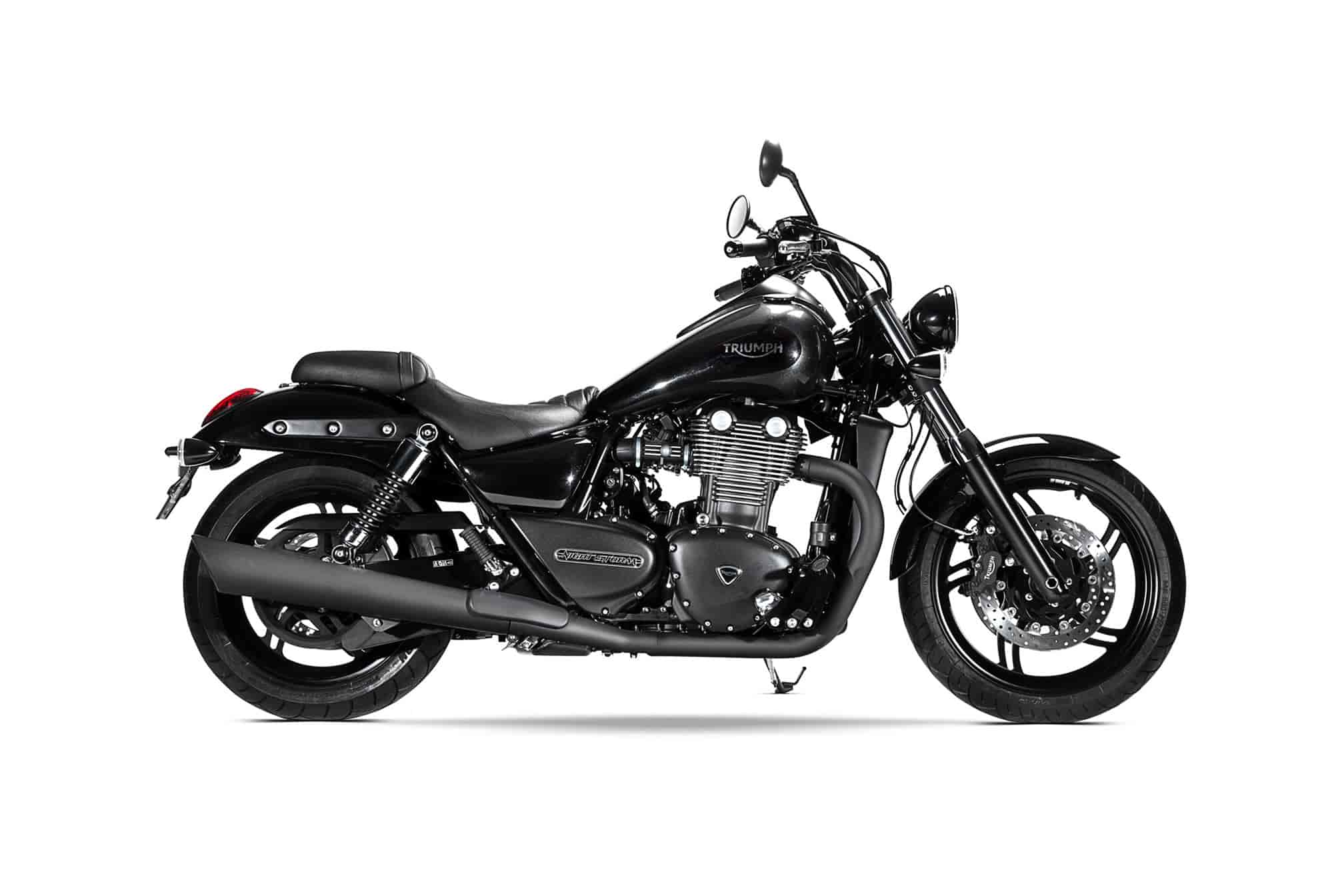 Available in long or short design, the High Flow silencer kit includes slash cut, tapered, triple-plated chrome silencers with improved gas flow for enhanced engine performance and a deeper exhaust note. Supplied with gaskets and replacement heat shield covers. Requires specific calibration to guarantee optimum performance. Off-road use only. (Image shows Thunderbird LT Silencer kit)