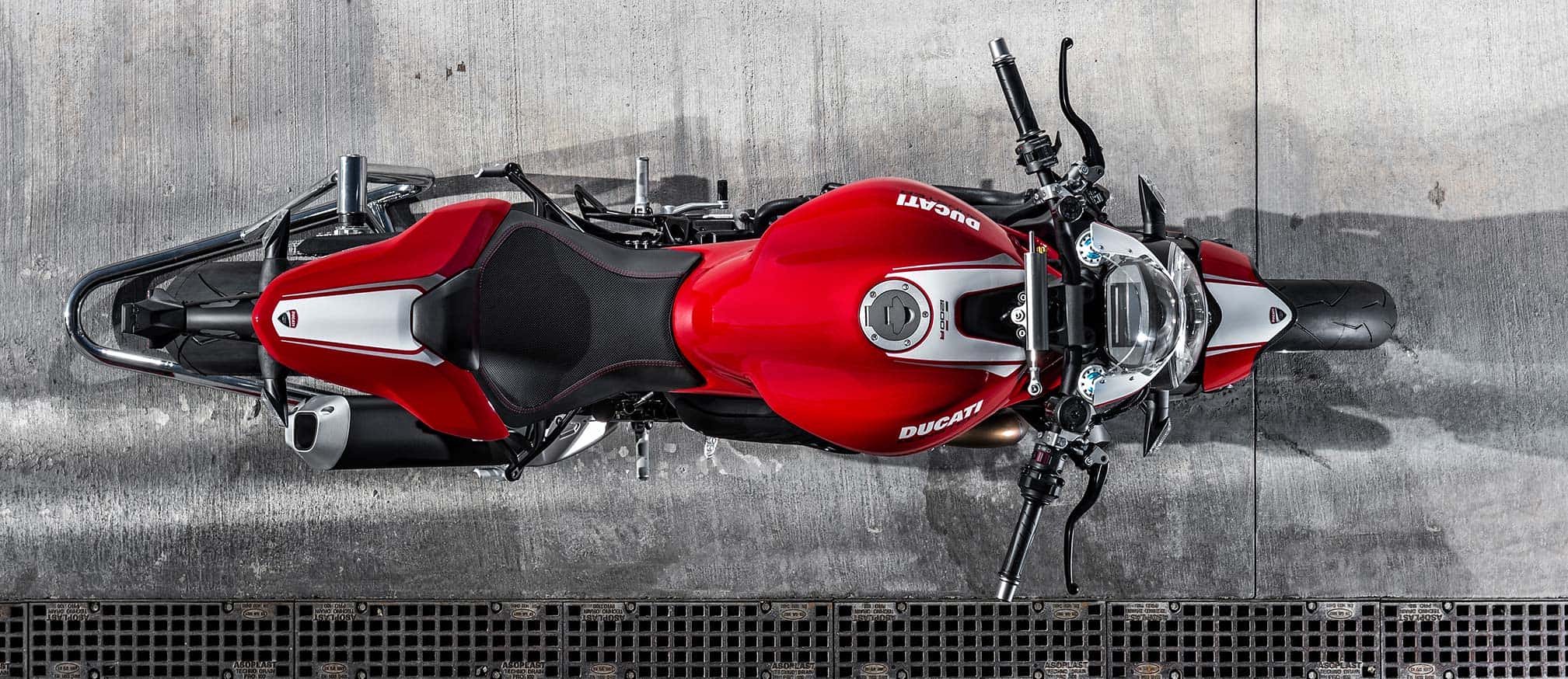 A core feature of the Monster family is the high-capacity steel fuel tank that enhances its powerful character. Emphasized by its thin flanks and the compact front headlight, the outline of the Monster resembles that of a charging bull. A clean, minimalist handlebar zone underscores the bike’s essential style, while close attention to detail is evident in the high-quality finish.