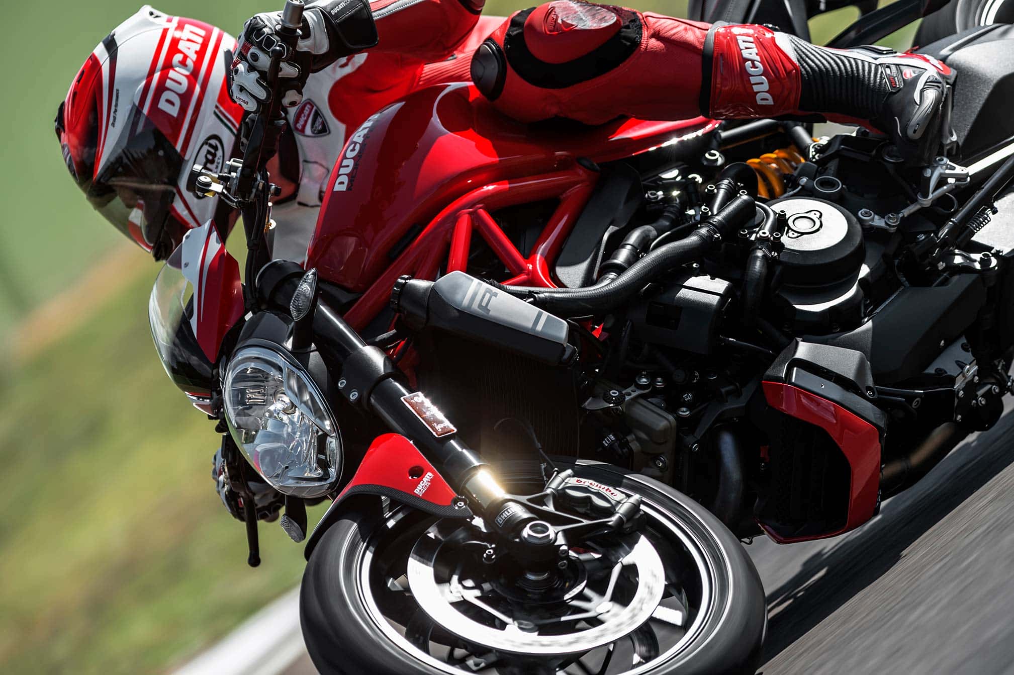 The “R” spirit that inspired the Monster 1200 is immediately recognisable in its completely redesigned, compact, lightweight and high-slung tailpiece, seat and high-mounted plate holder. The bike set-up and technical features are in line with the power rating of its “R” twin-cylinder engine. The latest naked model out of the Ducati factory features a higher stance than the Monster 1200 S, for more extreme lean angles and to make the most of the Pirelli Diablo Supercorsa SP tyres. At the rear end, grip is guaranteed by the 200/55 x ZR17 size tyres.
