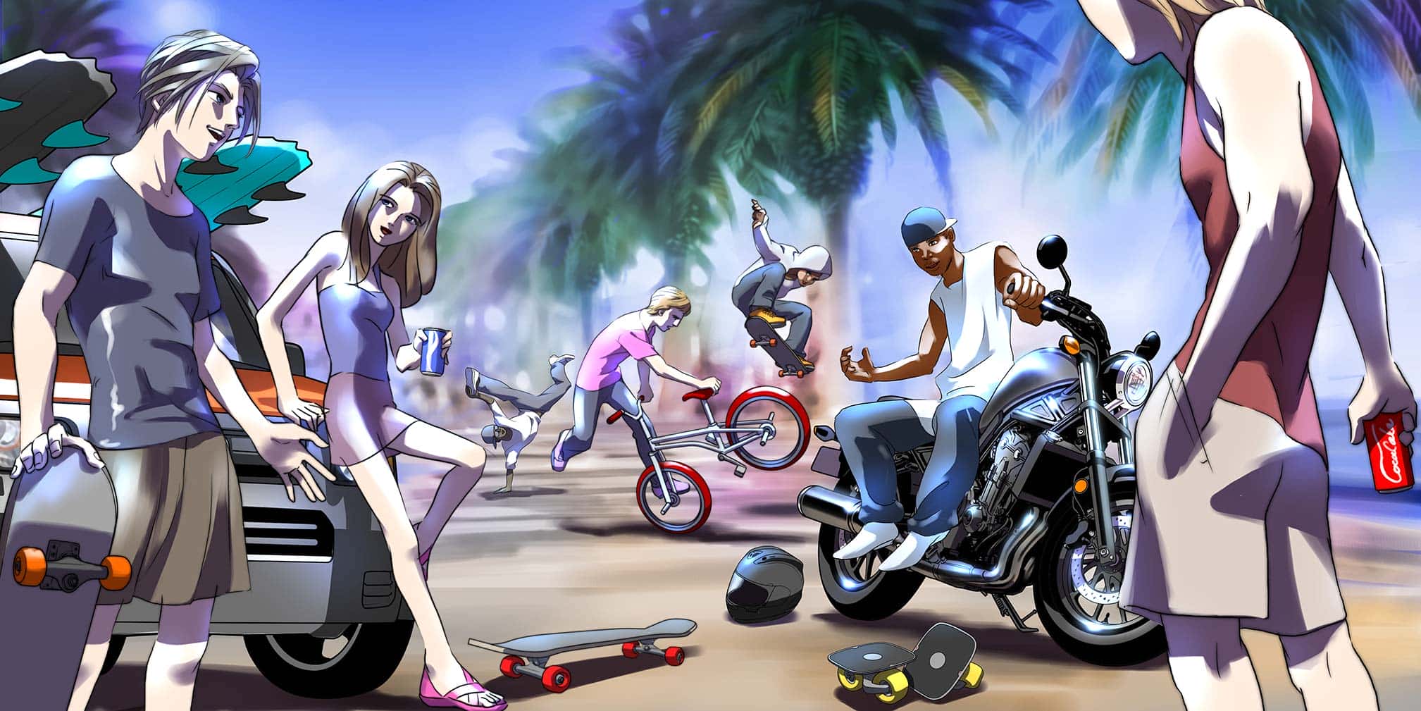 by iconic fuel tanks, aggressively raked front ends and fat tires on large-diameter