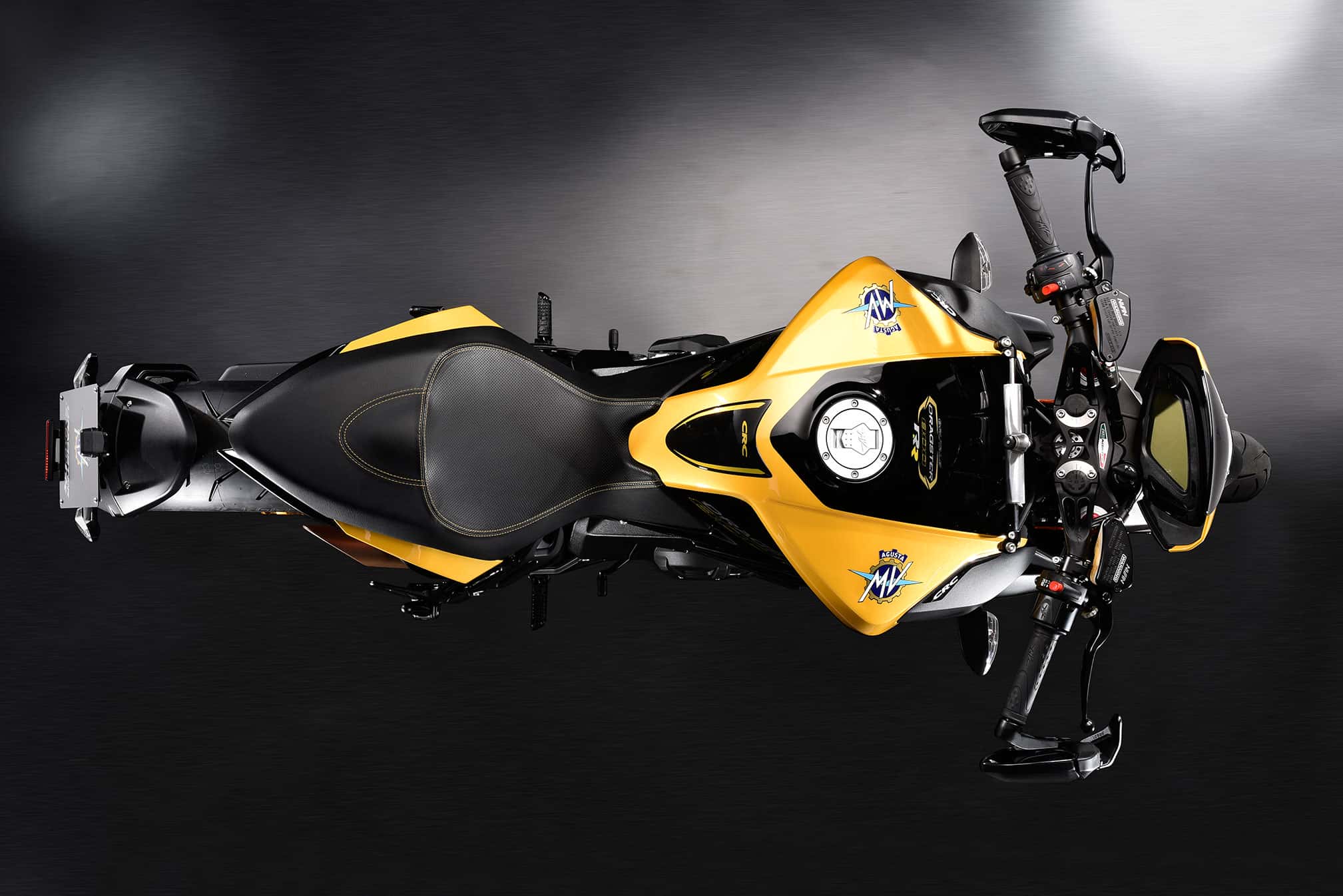 The Brutale 800 Dragster RR measurements are the same as those that made the Brutale 800 Dragster the benchmark for naked sport bikes. The wheelbase is 1,380 mm, with 95 mm of offset on the fork yokes. Tyre crosssections also remain unchanged, with the eye-catching Pirelli Diablo Rosso II 200/50 at the rear. The chassis structure employs a solution shared by on all the latest-generation MV Agusta bikes: an ALS steel tube trellis frame with integrated light aluminium profiles in the rear zone which acts as the pivot for the swingarm. This design choice, in addition to making MV models even more unique and immediately recognisable, effectively meets the dual needs of providing adequate torsional stiffness and keeping overall vehicle weight as low as possible. The suspension uses equally advanced and smoothly integrated components: more specifically, the bike now features a CRC steering damper that can be adjusted to adapt performance to the road, the track or, of course, rider preferences. The Marzocchi fork features upside down aluminium stanchions (43 mm diameter), now lighter and even more attractive thanks to the red anodizing; moreover, DLC (Diamond Like Carbon) coating enhances smoothness and maximises component strength. The 125 mm of travel is the same as that on the adjustable Sachs shock absorber attached to the swingarm. The seat (811 mm high) and pegs offer the same widely acclaimed ergonomics found on the Dragster 800, along with specially customised heel guards. Incredible stopping power is provided by the all-Brembo braking system, which has a pair of floating front discs (diameter 320 mm) equipped with 4-piston callipers and a rear 220 mm disc with a 2-piston calliper. The ABS system rounds out the package, ensuring safety and performance even on slippery or wet surfaces. New features include the stunning spoked wheels, which immediately distinguish the Brutale 800 Dragster RR from any other model: skilled use of anodizing, perfect assembly by hand, a great colour scheme – with black or white rims – make this component the focal point of the beefy yet classy coolness that this new MV Agusta exudes. Dedicated graphics and a flawless finish – as highlighted by the multiple layers of paint usually reserved for high end vehicles in the car industry – further emphasise the uniqueness of the Brutale 800 Dragster RR. Brute force. Panache. Charisma.