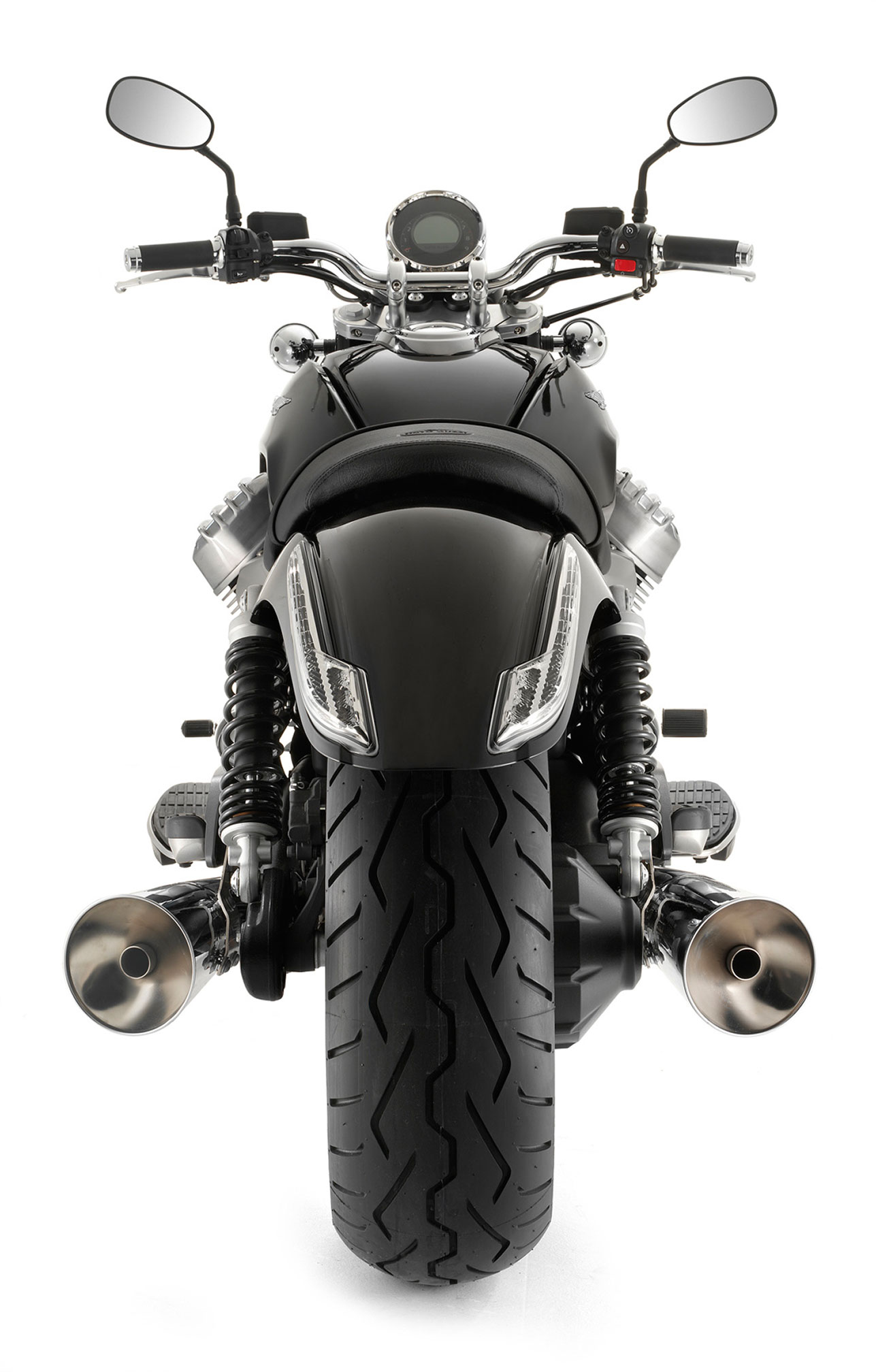 Once in the saddle, the differences compared to the Touring forcefully emerge: the new sport saddle and drag bar handlebars provide a low slung and backward sitting position over the rear wheel for perfect metropolitan showing off. One travels enveloped in the sound of the 1380 cc big bore, ready to unleash 120 Nm at 2750 rpm or cruise in overdrive, at little more than idling, trying to listen to the beats of the 104 mm pistons of the mighty 90° V-Twin made? in Mandello del Lario, filtered by the innovative elastic-kinematic fixing to the tubular frame.