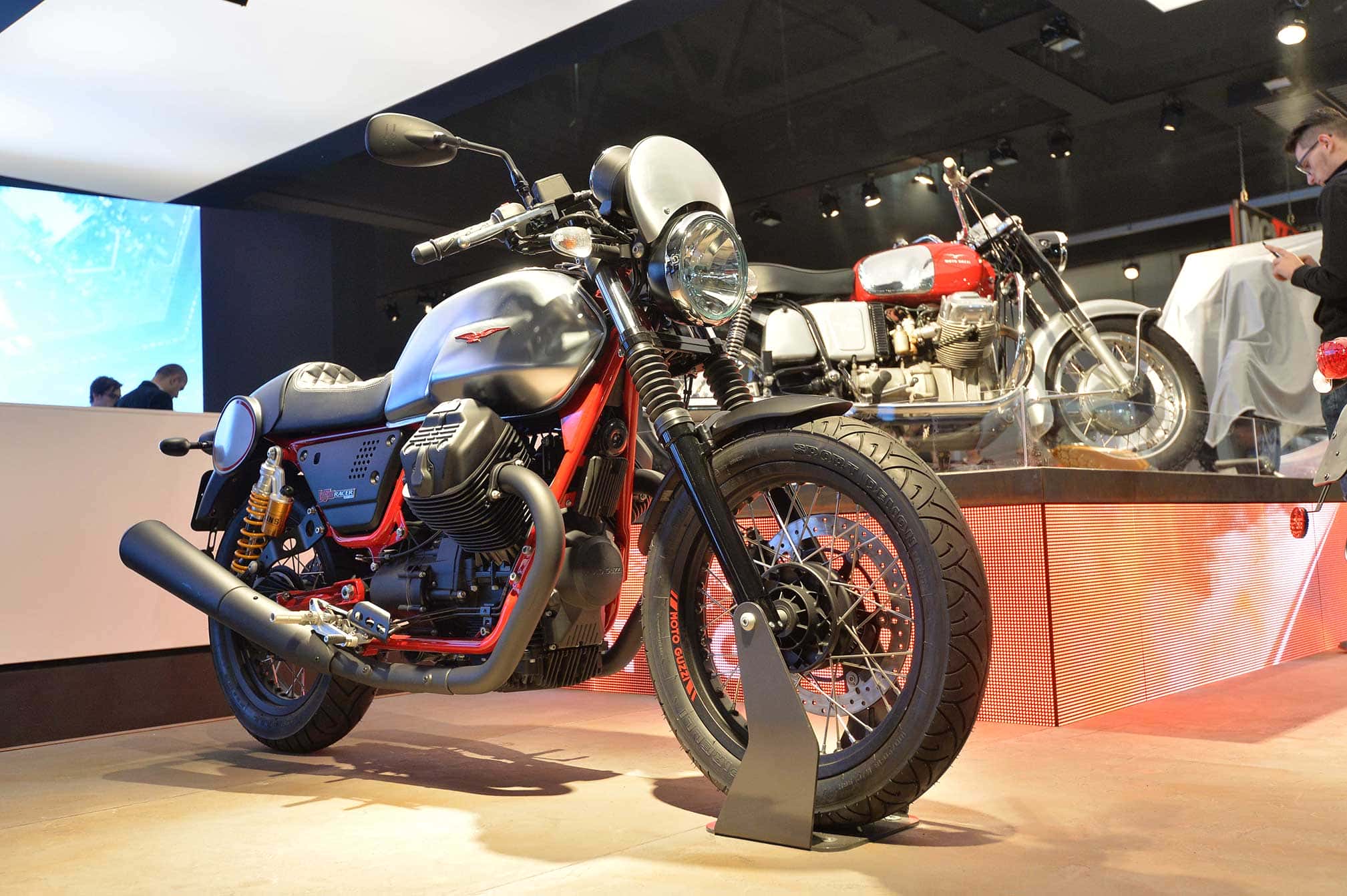 The spoked wheel rims have black channels and red Moto Guzzi stickers like the other sport models from the brand, including the Audace muscle bike. Other premium components that stand out are the set-back footpegs machined from solid billets, the lightened steering stem and the steering yoke guard.