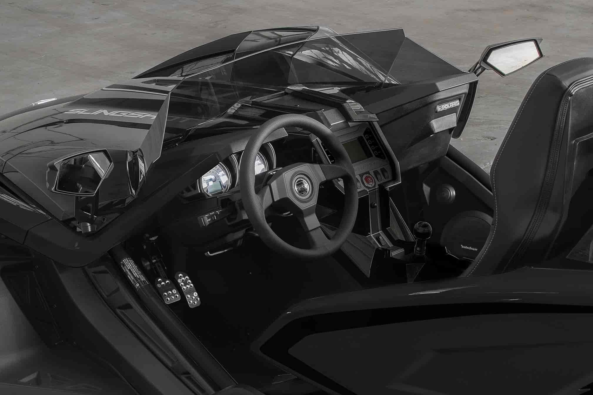Slingshot® is a three-wheeled motorcycle. It is not an automobile, it does not have airbags, and it does not meet automotive safety standards. Three wheel vehicles may handle differently than other vehicles, especially in wet conditions. Always wear DOT approved full face helmet and fasten seat belts. Driver may need a valid motorcycle endorsement. Don’t drink and drive.