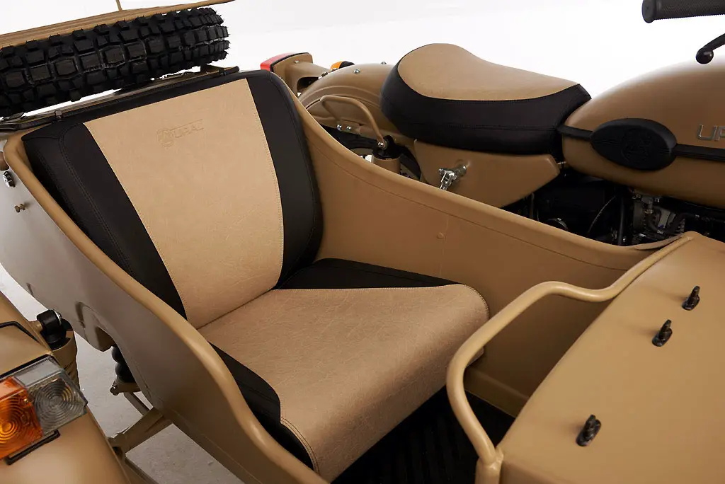 Nice ergonomic seat with sand deco for the passenger in the sidecar and also the driver may take place on such stylish seat