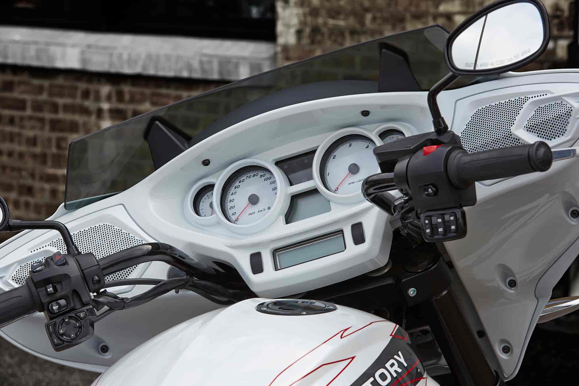 White-pearl paint with hand-applied electric-red pinstripes — Victory’s