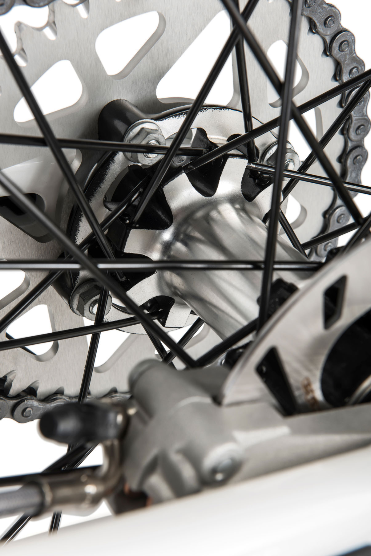 The wheels feature hubs that have been reinforced in the disc and sprocket attachment areas to boost impact-resistant reliability and are now mounted with Dunlop tires. The design has also been overhauled, with new graphics and colors on the bare anodized aluminum frame and black wheels with white/red decals.