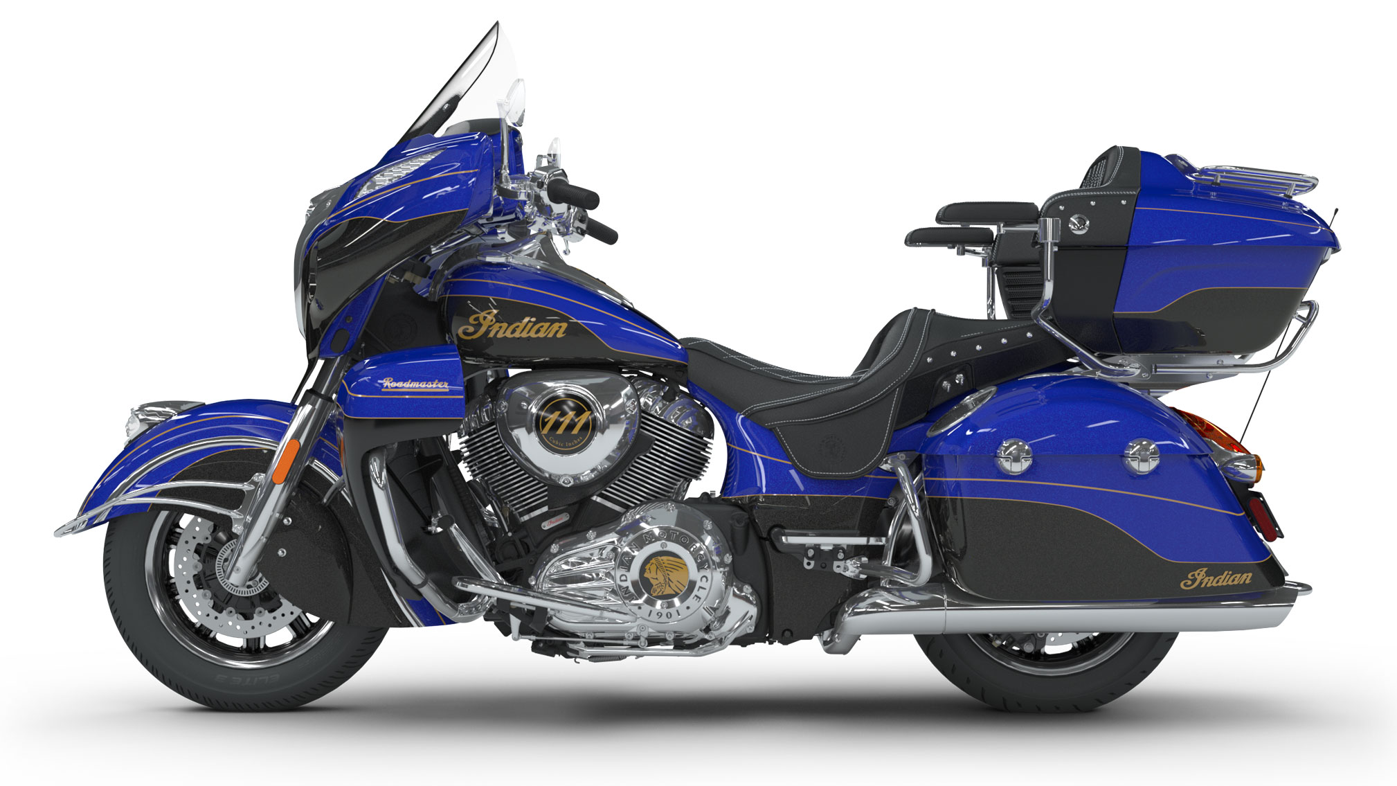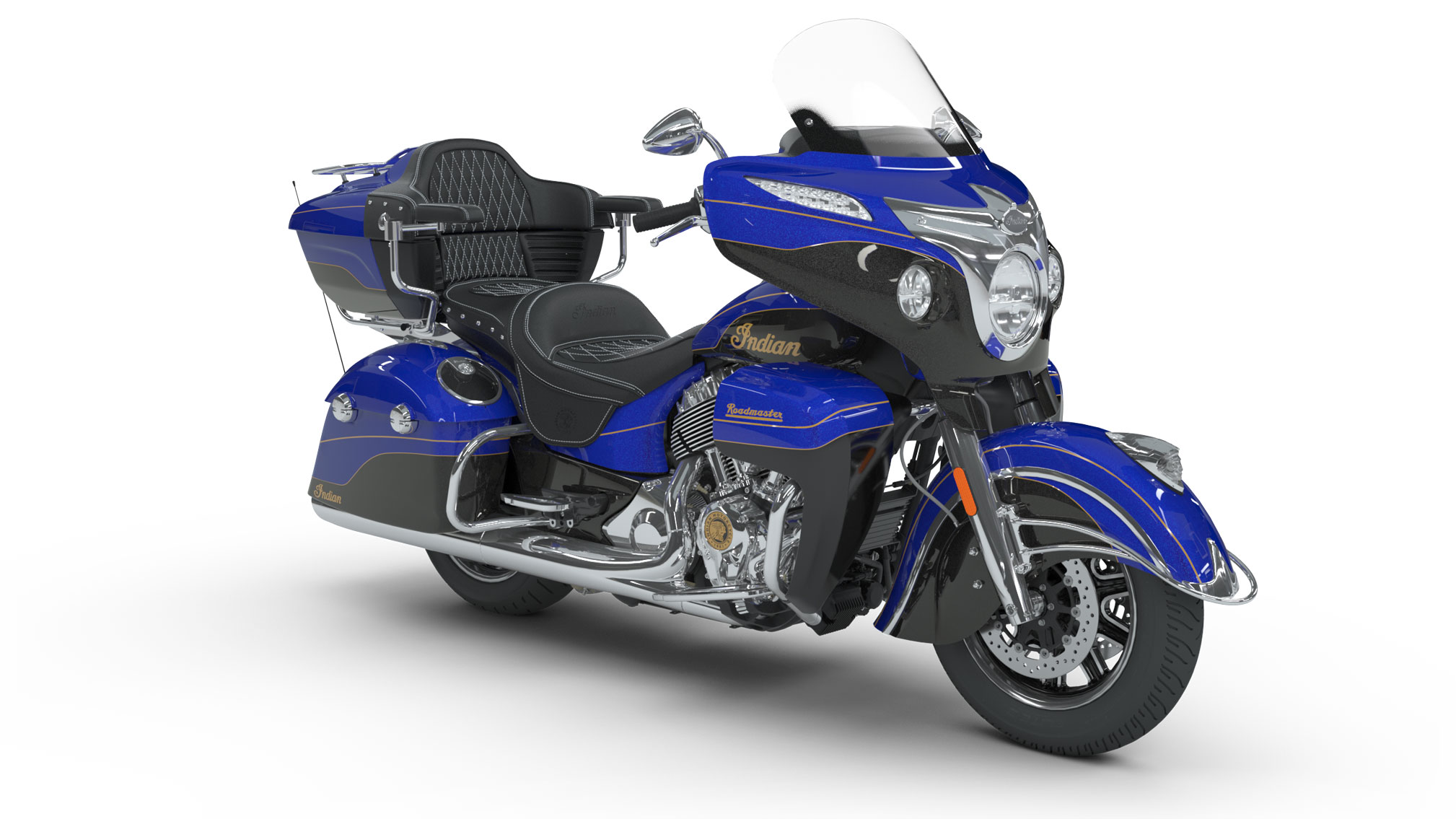 The ultra-premium Roadmaster®Elite features custom-inspired two-tone candy paint with real 23K gold leaf badging on the tank and lowers.