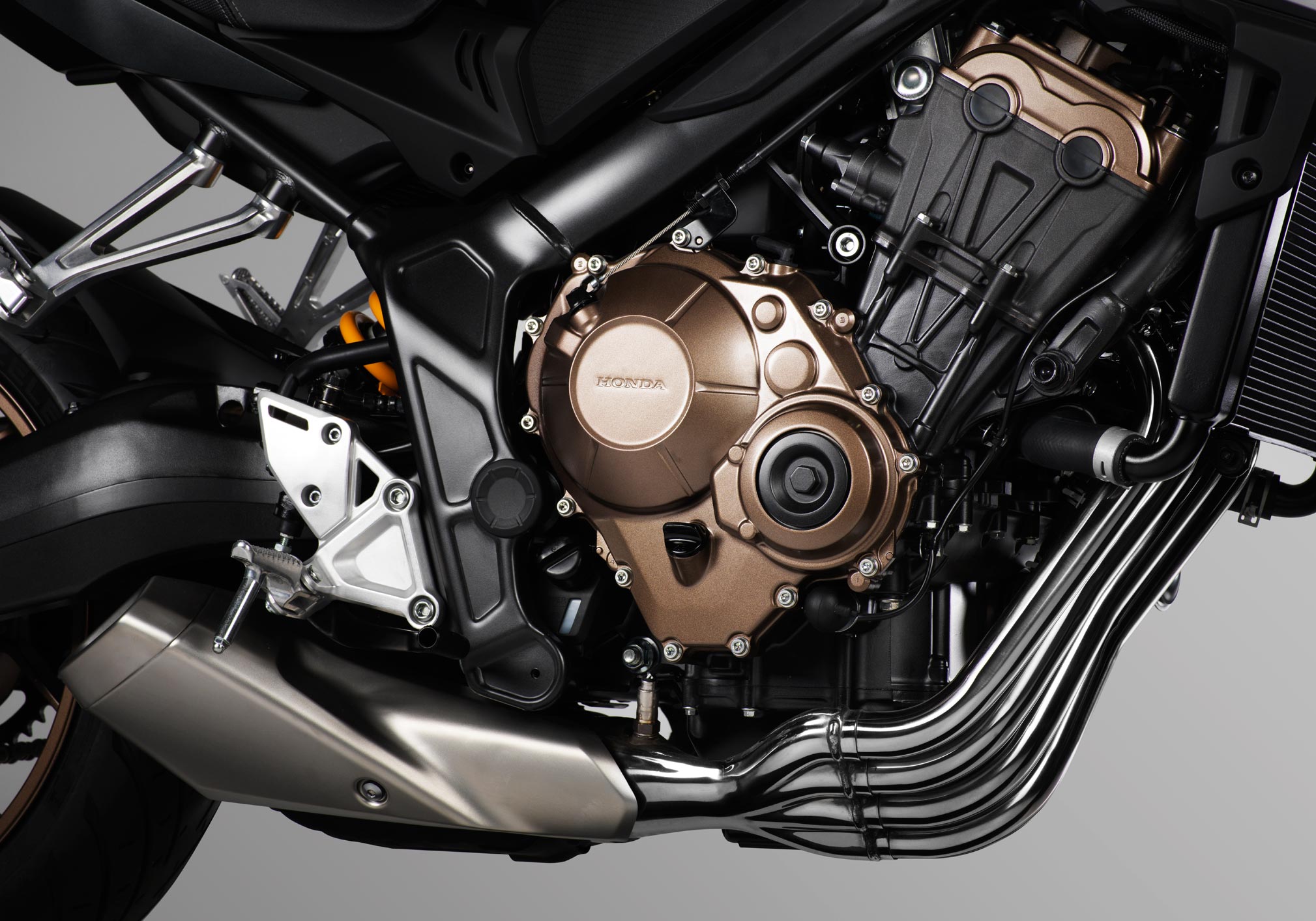 The engine uses a compact internal architecture, stacked six-speed gearbox and starter layout with the cylinders canted forward 30°. An assist/slipper clutch is a new addition and eases upshifts while managing rear-wheel lock up under rapid downshifts. On the ABS version only, Honda Selectable Torque Control (HSTC) manages rear-wheel traction; it can be turned off should the rider choose.