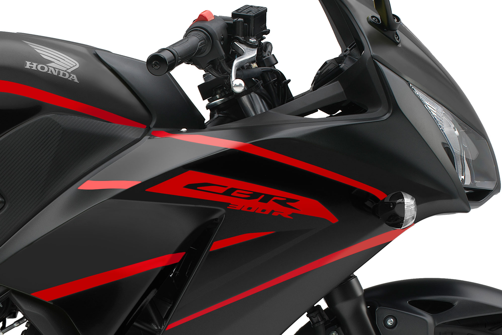 - High-quality full-coverage fairing with dual headlights evokes the styling of Honda’s flagship CBR1000RR supersport bike.