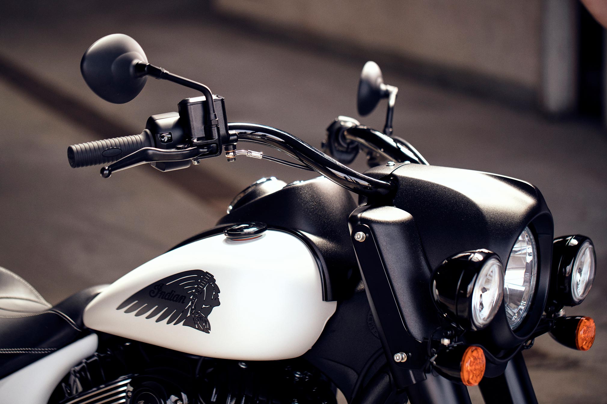 Indian Springfield® Dark Horse® is now offered in two colors –Thunder Black Smoke and a new White Smoke option. Also, notable for the 2019 Indian Springfield Dark Horse® Dark Horse® is the addition of the iconic Indian Motorcycle® headdress on the front fender and a 19″ contrast-cut wheel.