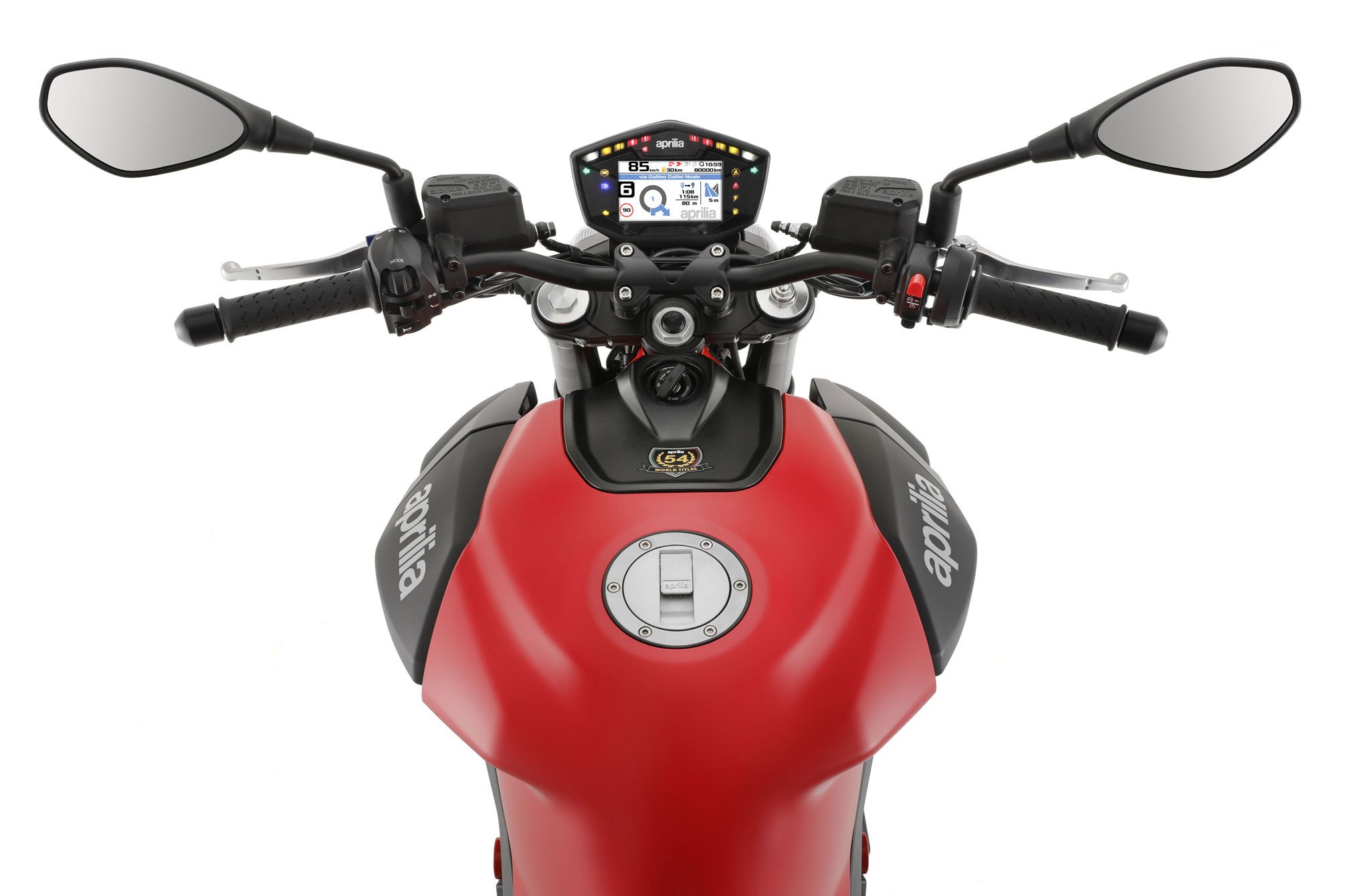 The control instrumentationis made up of an ultra modern TFT technology display that ensures perfect legibility of the information provided. The large, 4.3” screen (the same one used on the Aprilia RSV4 and Aprilia Tuono 1100 V4) allows all the on board information to be clear and highly legible at all times, thanks in part to its capacity of adapting the background and font colours based on the conditions detected by the light sensor. The information displayed includes: rev counter, speedometer, selected gear indicator, coolant temperature, air temperature, selected engine map and clock. Using the practice MODE joystick on the new left hand electrical block, you can navigate through the menu and scroll/adjust the following parameters: odometer, traction control level, ABS ON (only when not in movement), MENU (only when not in movement), Trip A, Trip A time, Trip A maximum speed, Trip A average speed, Trip A average consumption, Trip B, Trip B time, Trip B maximum speed, Trip B average speed, Trip B average consumption, instantaneous consumption, Km ridden in reserve.