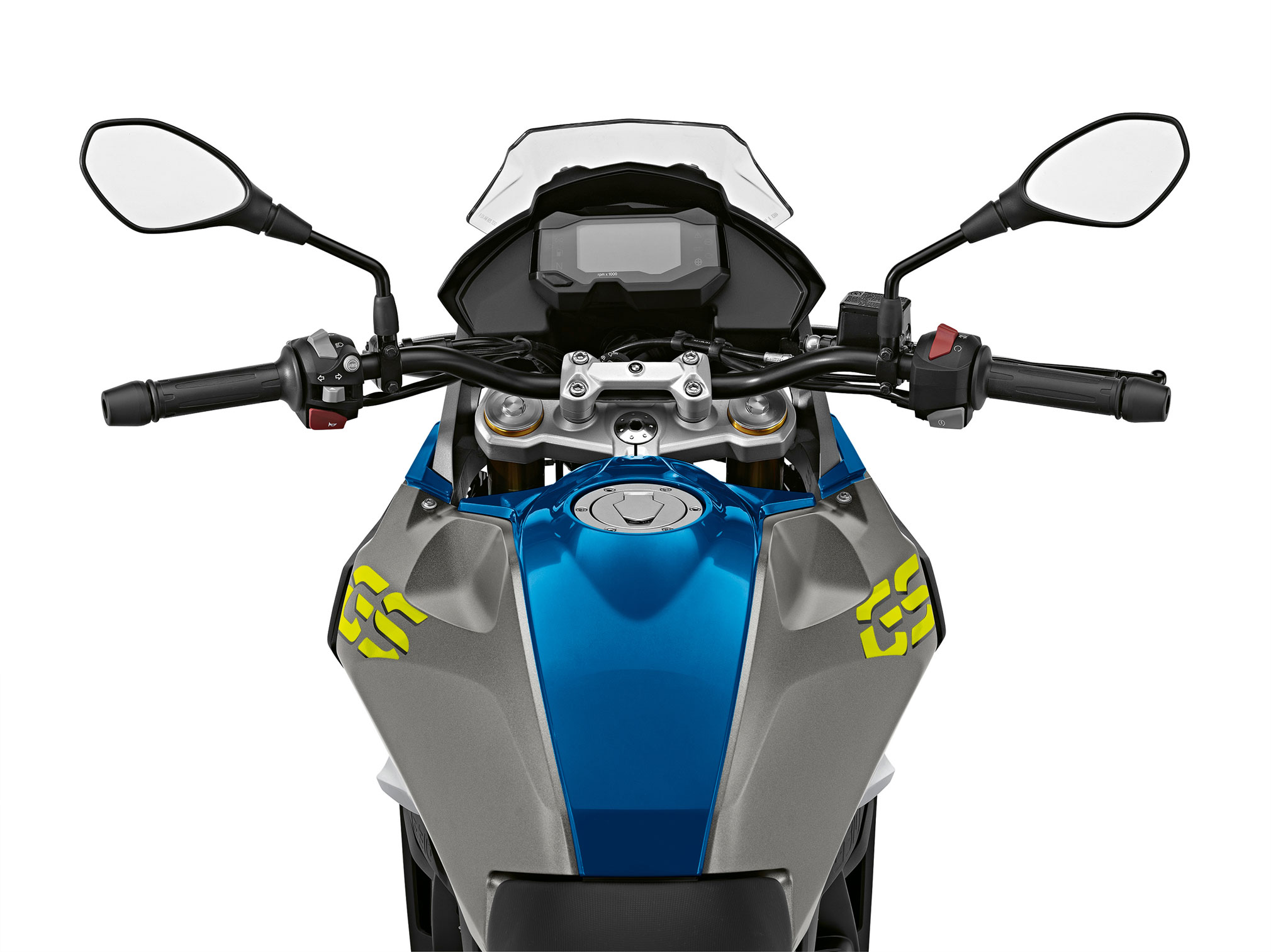 Seen from the top, too, the BMW G310 GS looks more like a model belonging to a larger capacity segment. The characteristic front fender runs as a band of color emerging from the headlamp mask across the fuel tank to the side trim, making the BMW G 310 GS instantly recognizable as a GS even from a bird’s-eye perspective. The powerful surfaces of the fuel tank give it a clearly defined, muscular look. At the same time, the striking surface styling of the fuel tank allows for a maximum steering angle and therefore excellent maneuverability in tight spaces.