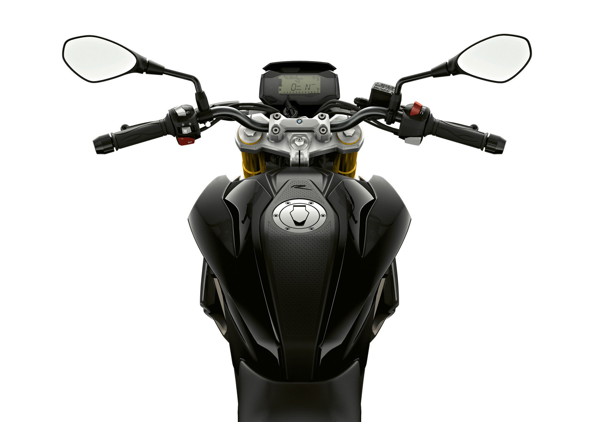 Despite its compact nature, the BMW G 310 R appears large and mature when compared to other models within its segment. The small headlamp mask with striking headlamp, the powerful front section and the dynamic rear give the BMW G 310 R a self-assured presence on the road. Seen from the top, too, the BMW G 310 R looks more like a model from a larger capacity segment. The powerful surfaces of the fuel tank also give it a clearly defined, muscular look.