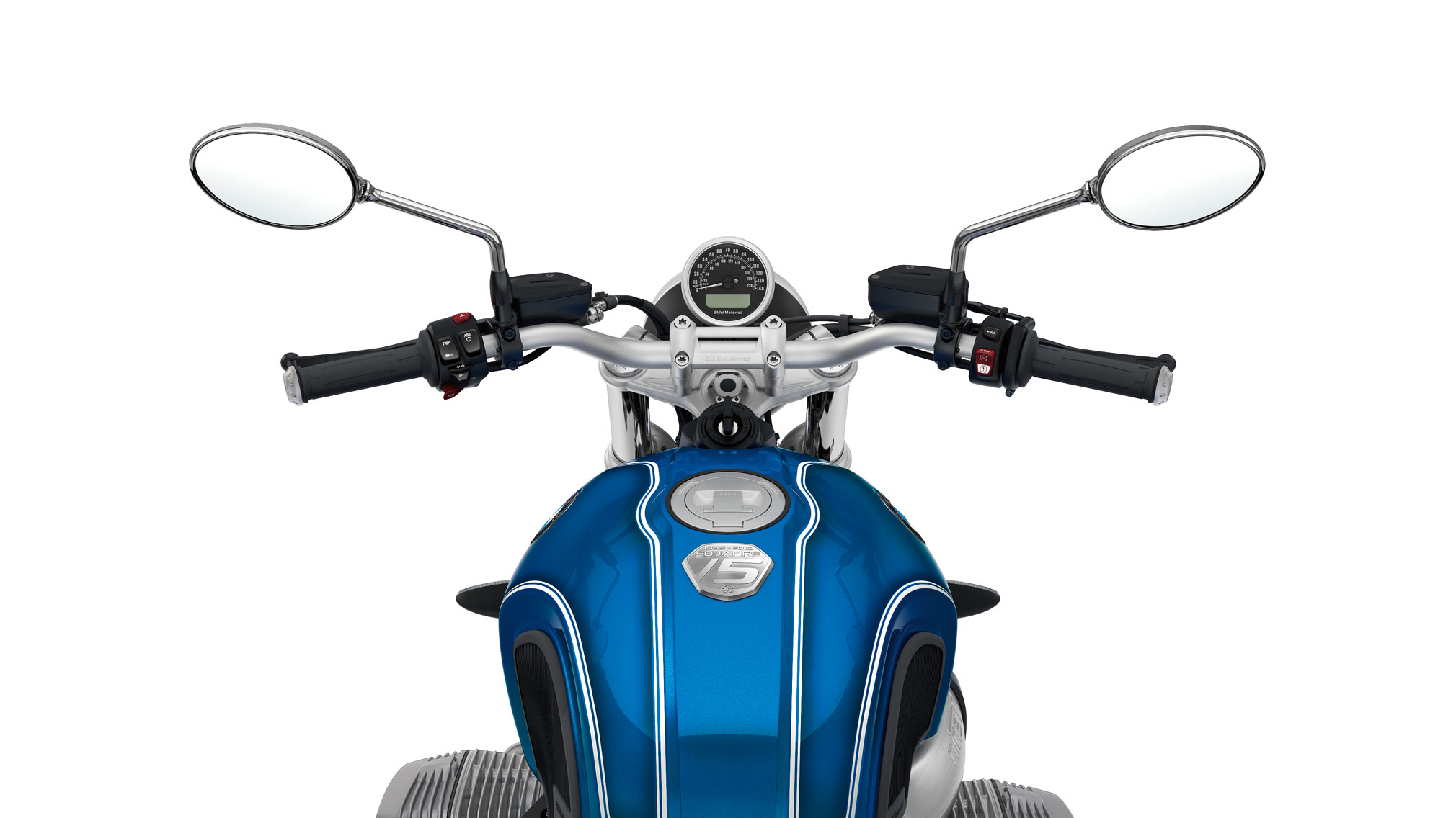 likewise finished in Lupine Blue metallic. Finally, the anniversary character of the R nineT /5 is emphasised with a “50 Jahre /5” emblem on the top