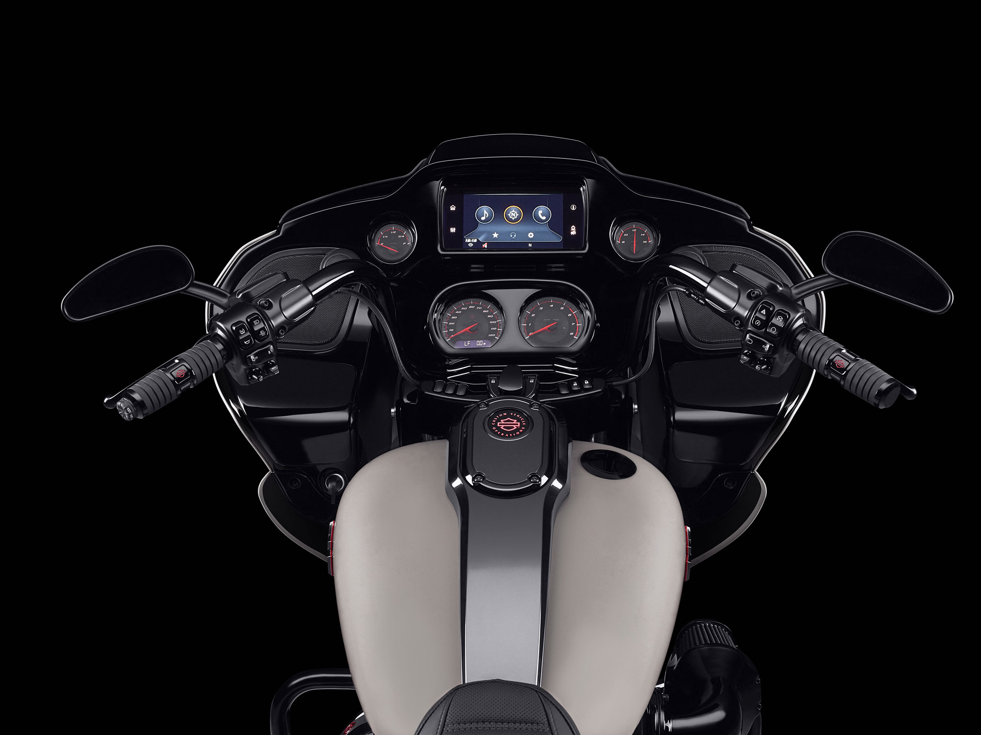 The CVO Road Glide model is equipped with a Boom!™ Box GTS infotainment system with four Boom!™ Stage II bi-amped speakers (paired in fairing and saddlebag lids), 150 watts per channel from two separate 300-watt amplifiers for 600 watts total power. The 6.5-inch color touchscreen is covered with durable Corning® Gorilla® Glass and offers low reflectivity with minimal sun washout for exceptional visibility in all situations. Additional features include advanced navigation, Apple CarPlay® compatibility, personalization options, and integration with the Harley-Davidson App. The entire system can be managed through the touch screen, the motorcycle hand controls and by voice commands. An evolved interface experience that offers a contemporary look, feel and function, with exceptional durability and features designed specifically for motorcycling. Every element is optimized to enhance the rider’s interaction with the bike and connectivity with the world.
