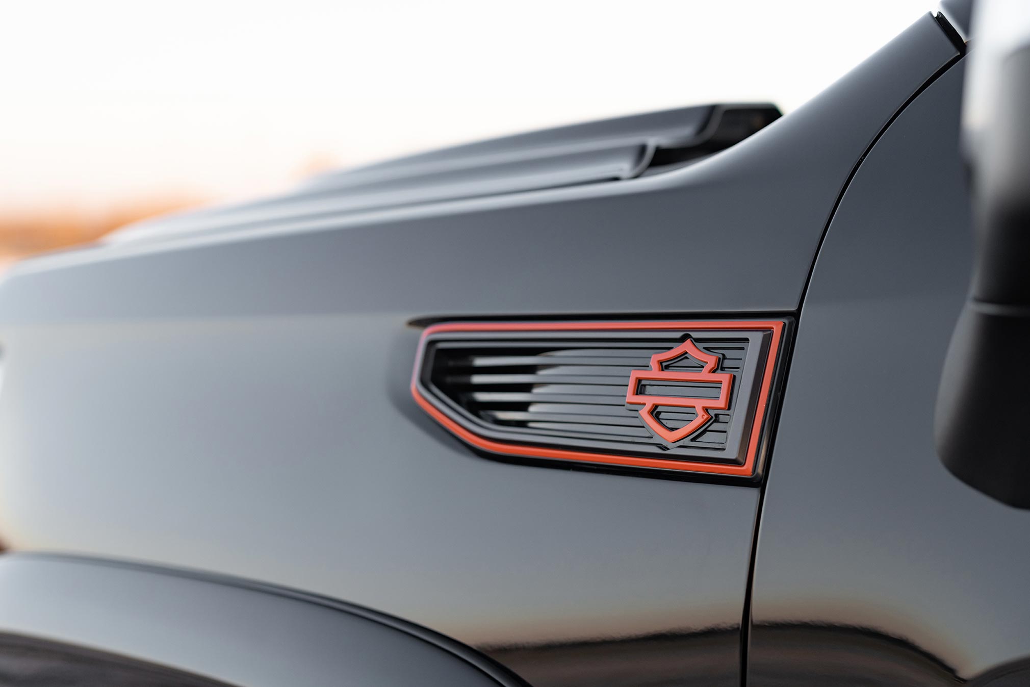 Additional edition-specific components that add to the aggressive look of the truck include, custom tuned BDS suspension lift with upgraded Fox shocks, 35” all-terrain tires, lighted power deploying running boards with unique integrated rocker trim, custom fender flares, functional fender vents, front bumper redesign with integrated LED light bar, custom design Harley-Davidson grille with Bar & Shield insert, replacement functional Harley-Davidson designed induction style hood, rear bumper redesign with custom exhaust ports, Harley-Davidson tailgate appliqué, color-matched Harley-Davidson inspired tonneau cover with debossed Harley-Davidson bar and shield logo, carpeted bed mat with Harley-Davidson logo, Harley-Davidson floor mats, Harley-Davidson door entry sills, custom accent color door, dash and steering wheel trim.