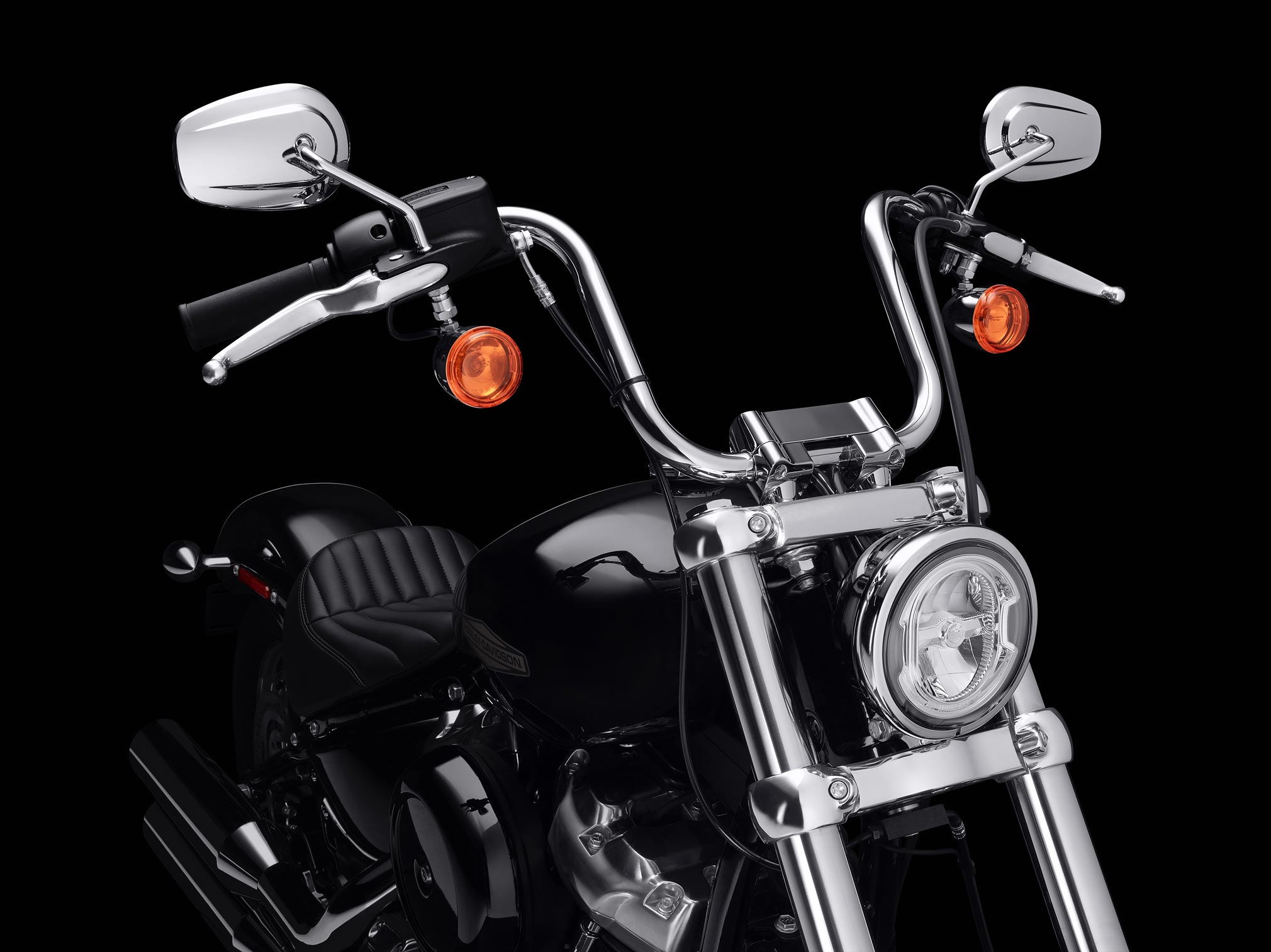 The steel rims of the classic laced wheels (front 19-inch, rear 16-inch) are finished in brilliant chrome for dazzling style. The front end features clear-coated fork sliders, polished triple-clamps, polished top clamp and riser, and chromed headlamp bezel and turn signals for additional contrast to the Vivid Black paint. The mini-ape handlebar puts riders of the Softail Standard model in a fists-in-the-wind posture with instant attitude. A compact electronic instrument with digital display set in the handlebar riser keeps the front end clean and uncluttered.
