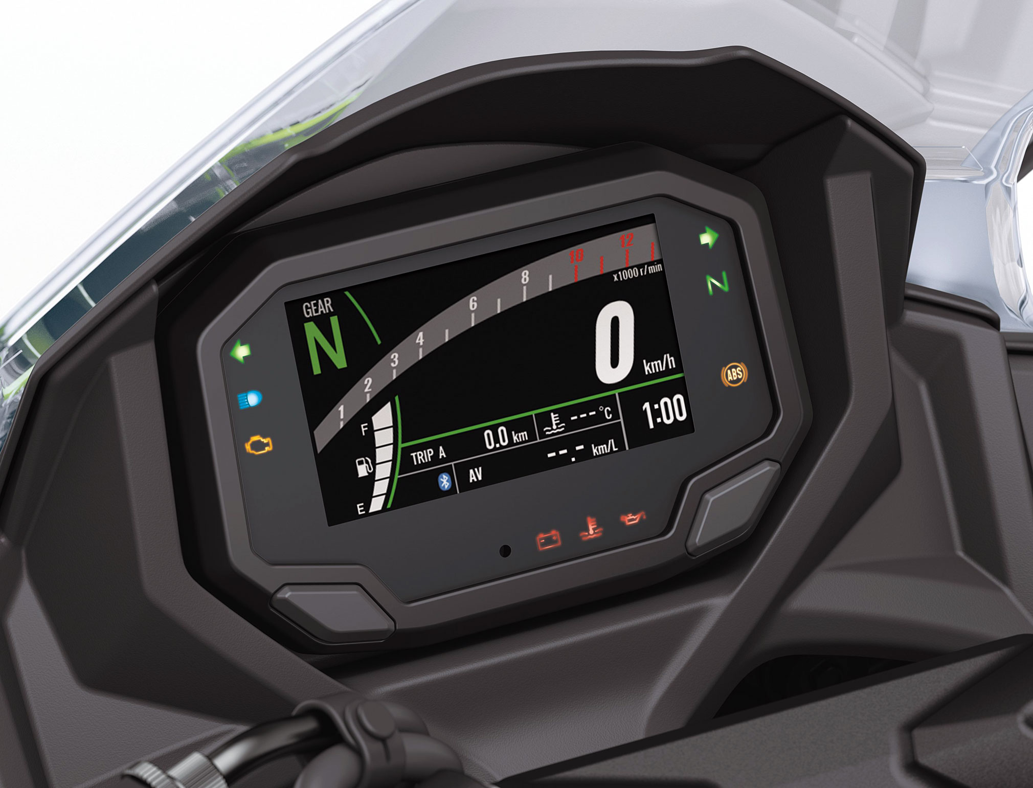 - Display functions include: digital speedometer, digital bar- style tachometer, gear position indicator, shift lamp, fuel gauge, odometer, dual trip meters, current and average fuel consumption, remaining range, average speed, total time, coolant temperature, clock, battery voltage, Kawasaki service reminder, oil change reminder and the Kawasaki Economical Riding Indicator.