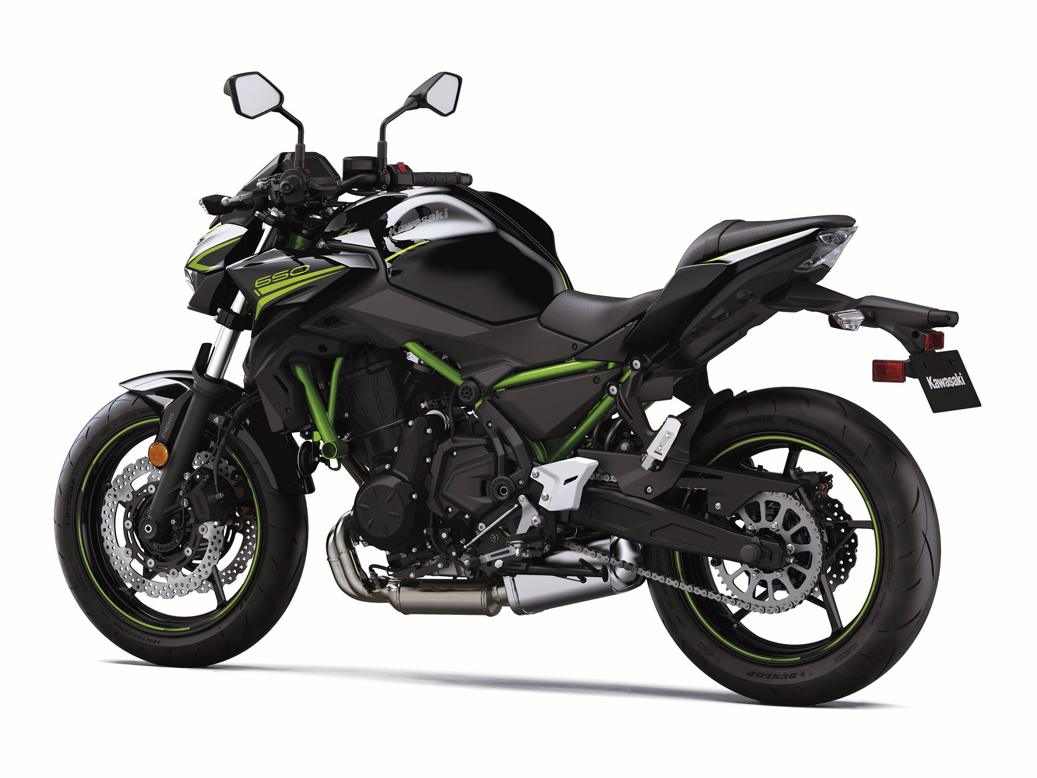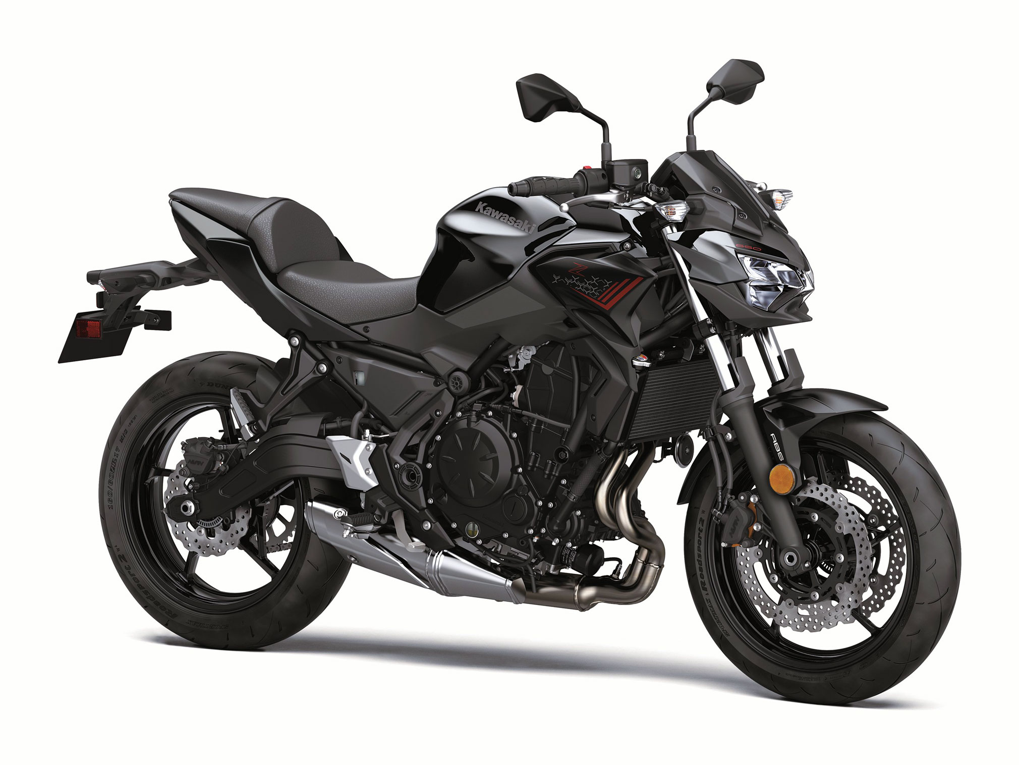 Enhancing performance on the 2020 Kawasaki Z650 are new Dunlop Sportmax Roadsport 2 tires, which help to improve upon the lightweight and nimble handling of the Z650.