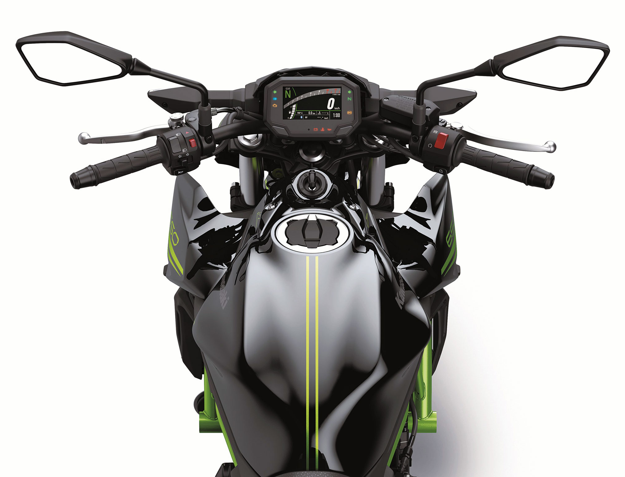 The new 4.3” all-digital TFT color instrumentation gives the cockpit of the Z650 motorcycle a high-tech, high-grade appearance. The full color display features TFT (thin-film transistor) technology delivers a high level of visibility. The screen’s background color is selectable (black or white), and screen brightness adjusts automatically to suit available light. Display functions include: digital speedometer, digital bar-style tachometer, gear position indicator, shift lamp, fuel gauge, odometer, dual trip meters, current and average fuel consumption, remaining range, average speed, total time, coolant temperature, clock, battery voltage, Kawasaki service reminder, oil change reminder, and Economical Riding Indicator.