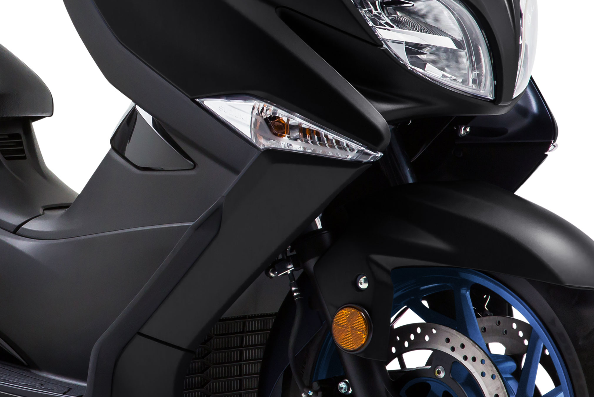 | The scooter’s nose features sharply styled dual LED headlights with integrated LED position lights and turn signals mounted beneath. The clean and bright front end is instantly recognizable as a Suzuki Burgman. | |