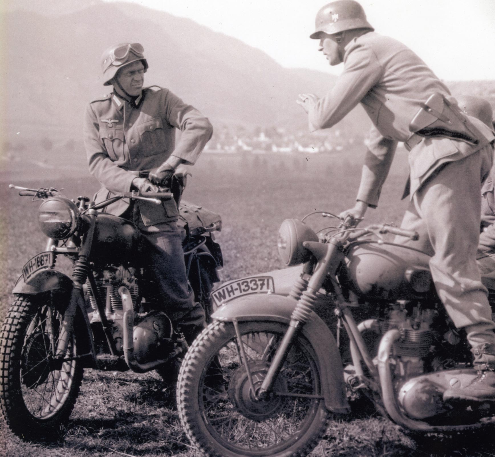 Between them, using small trial and error practice jumps, McQueen and Ekins worked out the capabilities of their favourite off-road choice, a 650cc Triumph TR6 Trophy, to squeeze maximum dramatic effect from the scene. They calculated that an 80mph run-up was required to clear a raised twelve-foot barbed-wire fence onto an inclined landing area around 60ft away. All on grass. McQueen was sensibly prevented, by the movie’s insurers from performing the stunt himself, much to his frustration, so Ekins stepped in.