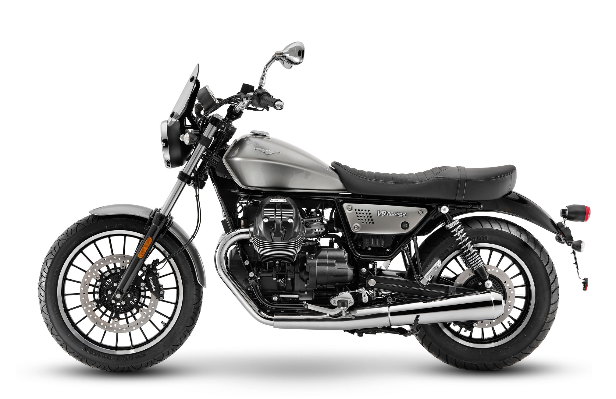 Moto Guzzi V9 Roamer is available in the unique Grigio Lunare colour scheme, which favours glossy colours for the mudguards, fuel tank and side panels in order to enhance the elegance of this model.