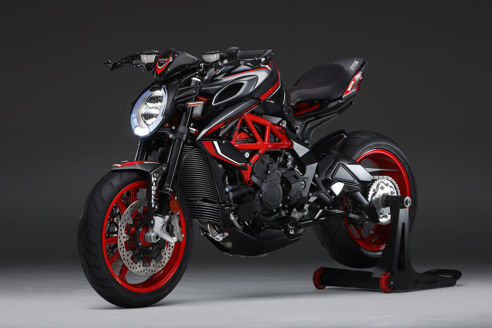 A special livery, SC-Project exhaust with a dedicated ECU control unit and the forged aluminum wheels are the finishing touches given to the Dragster 800 RC by the MV Agusta Reparto Corse engineers.